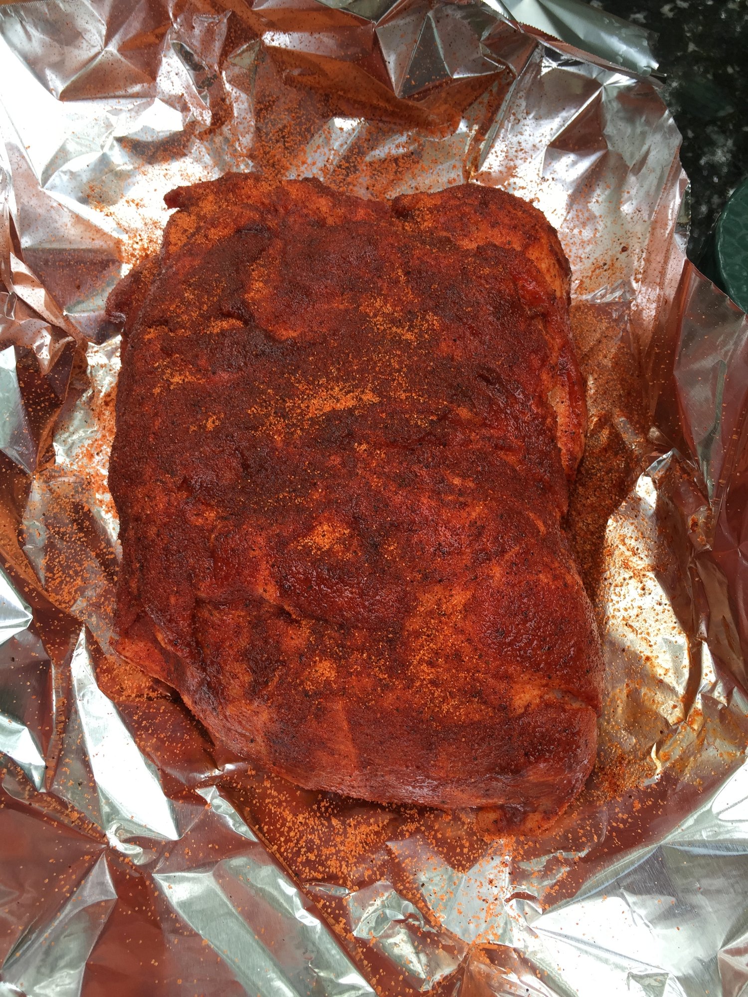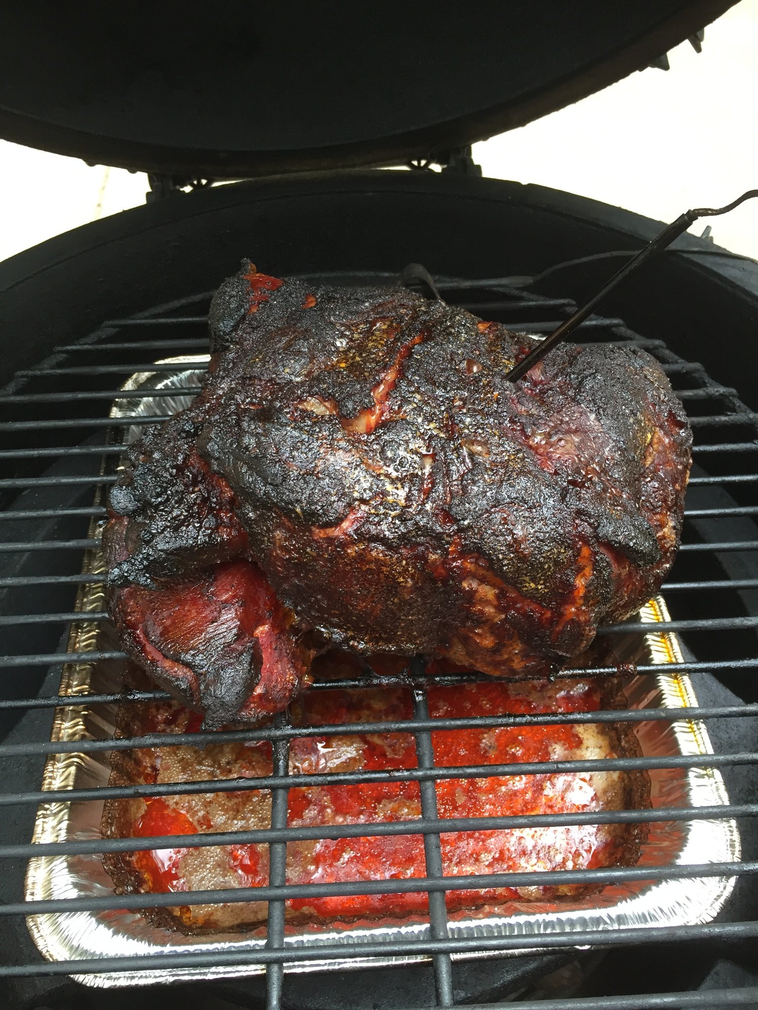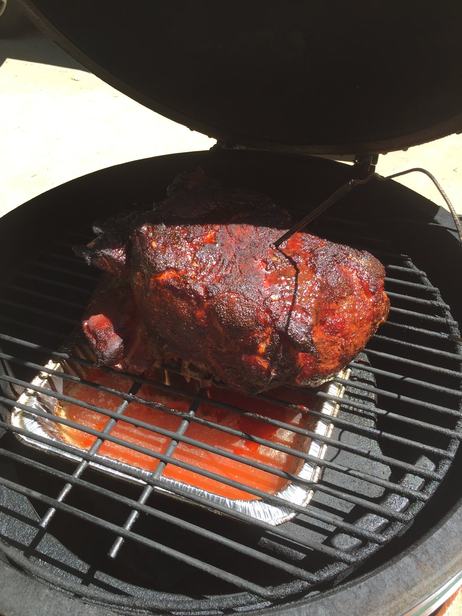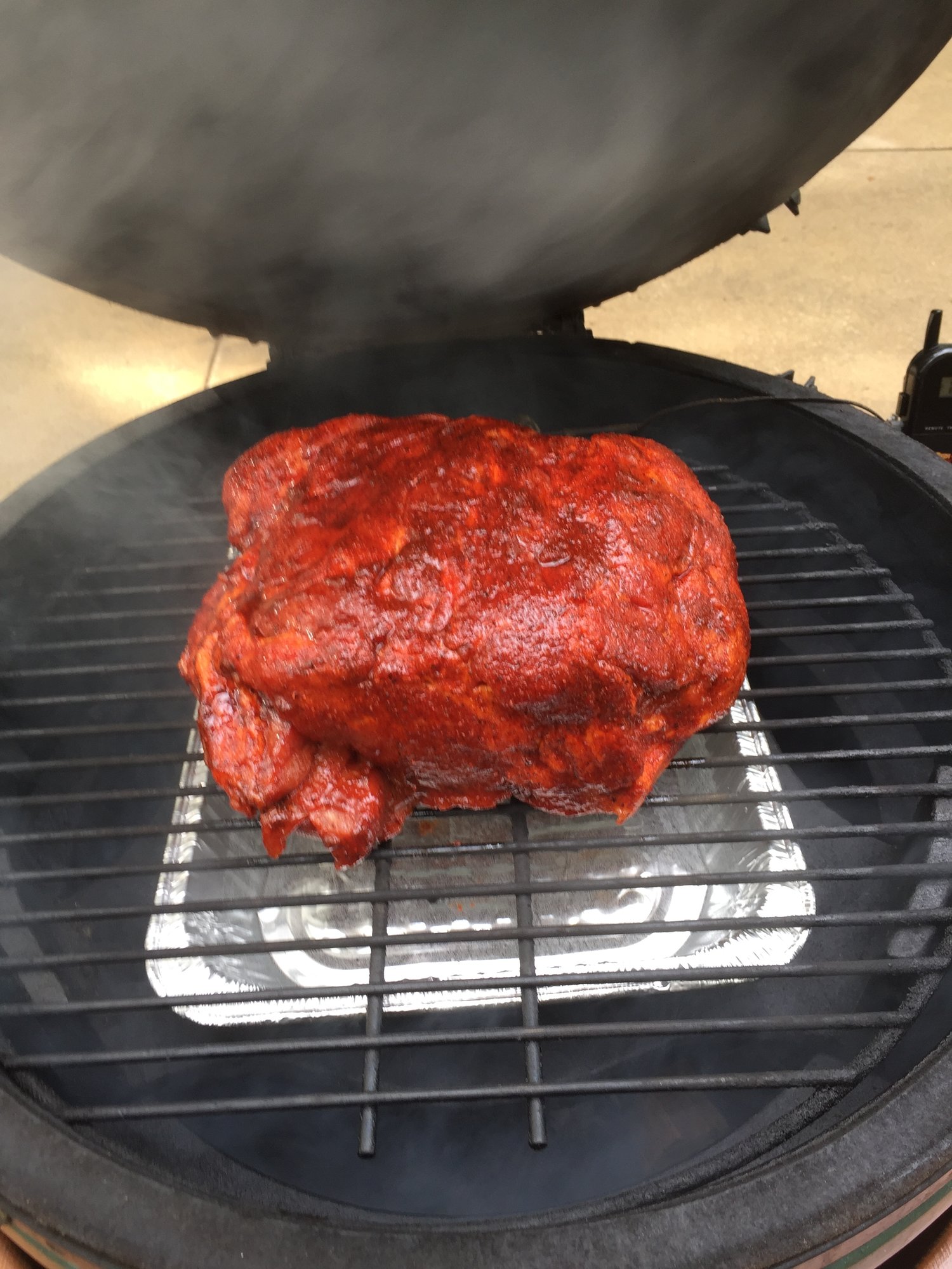 8 lb boneless pork Butt from Costco rubbed with Meatchurch Gospel. Set up the egg for 250 with apple wood and headed out the door with the fam.