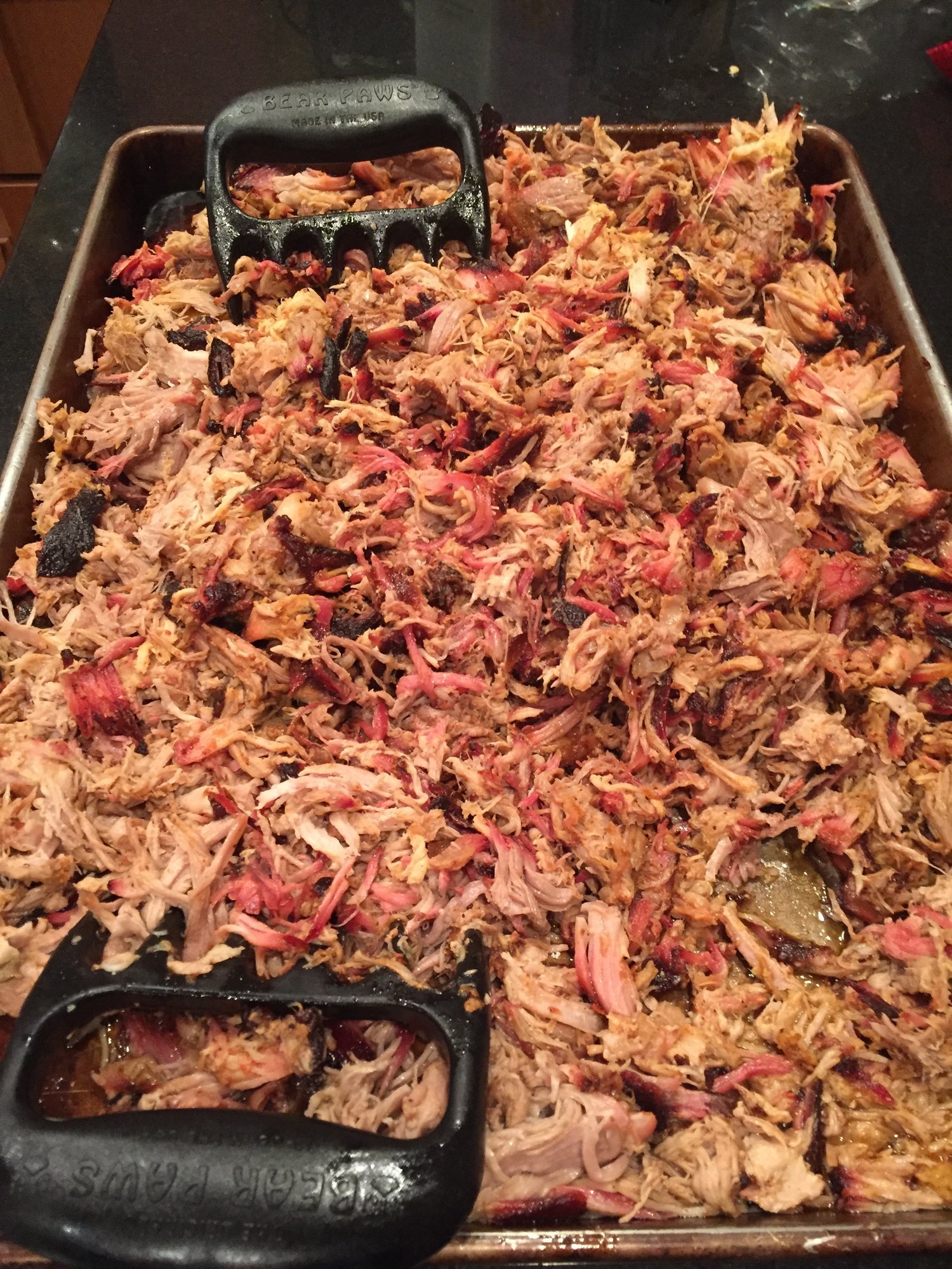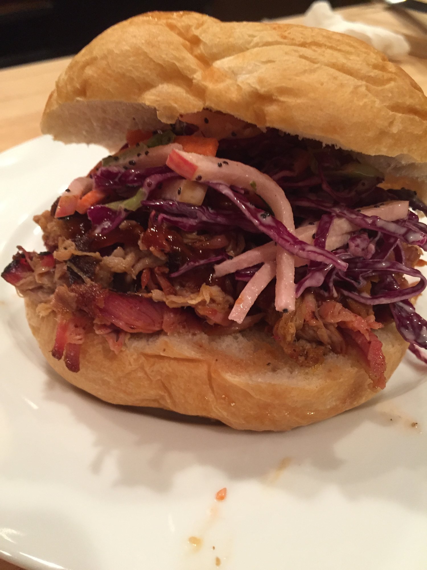 Homemade apple slaw ala Wolfgang Puck. Observations: I kinda liked the juiciness of the wrapped butt and wrapping that late didn't seem to affect the bark negatively. The Gospel is quite a nice little rub in this application. I really enjoy a nice spicy vinegar sauce splash on my pork sandwich. I need to pick more strawberries next time so I can make more rounds!