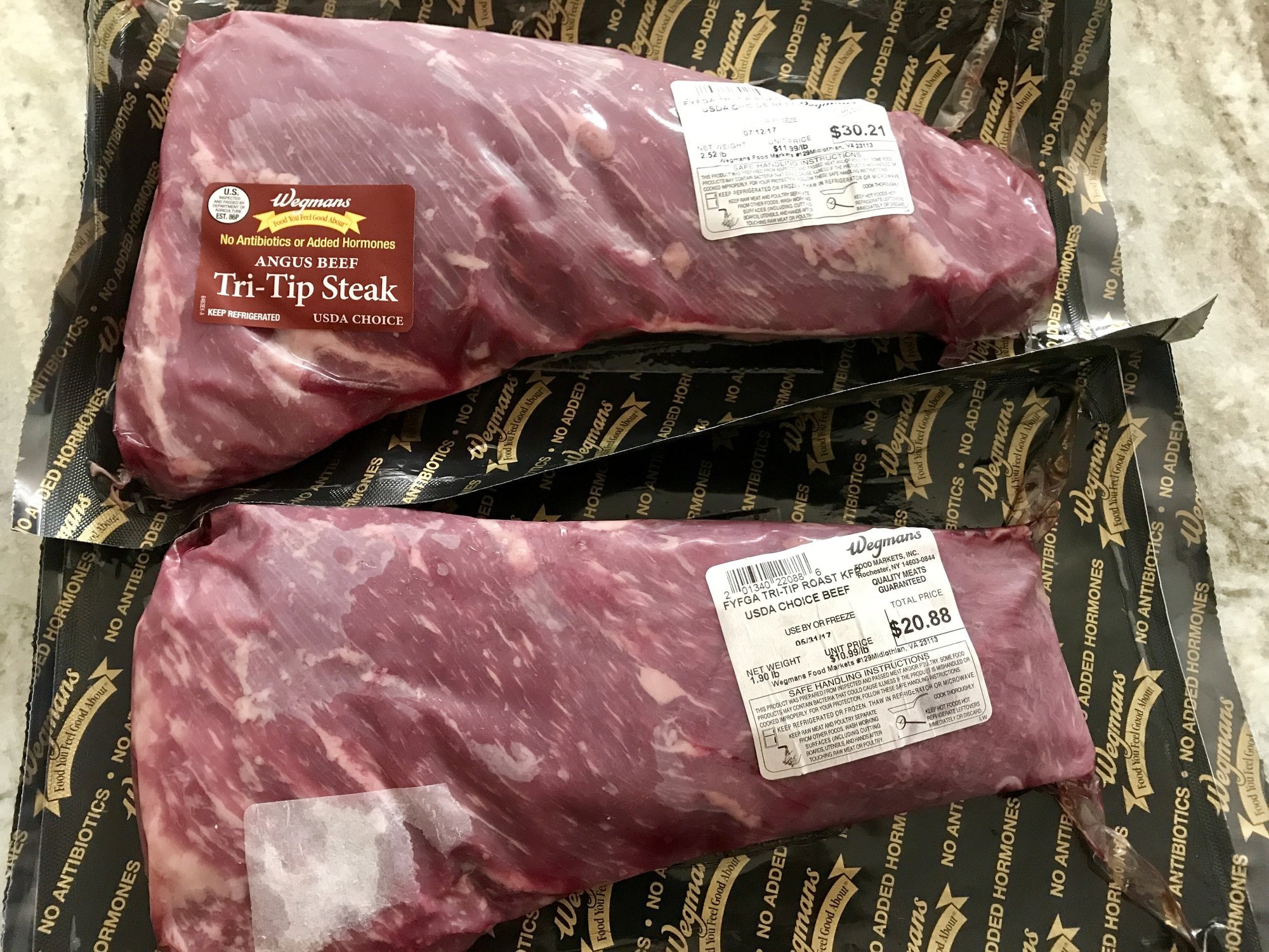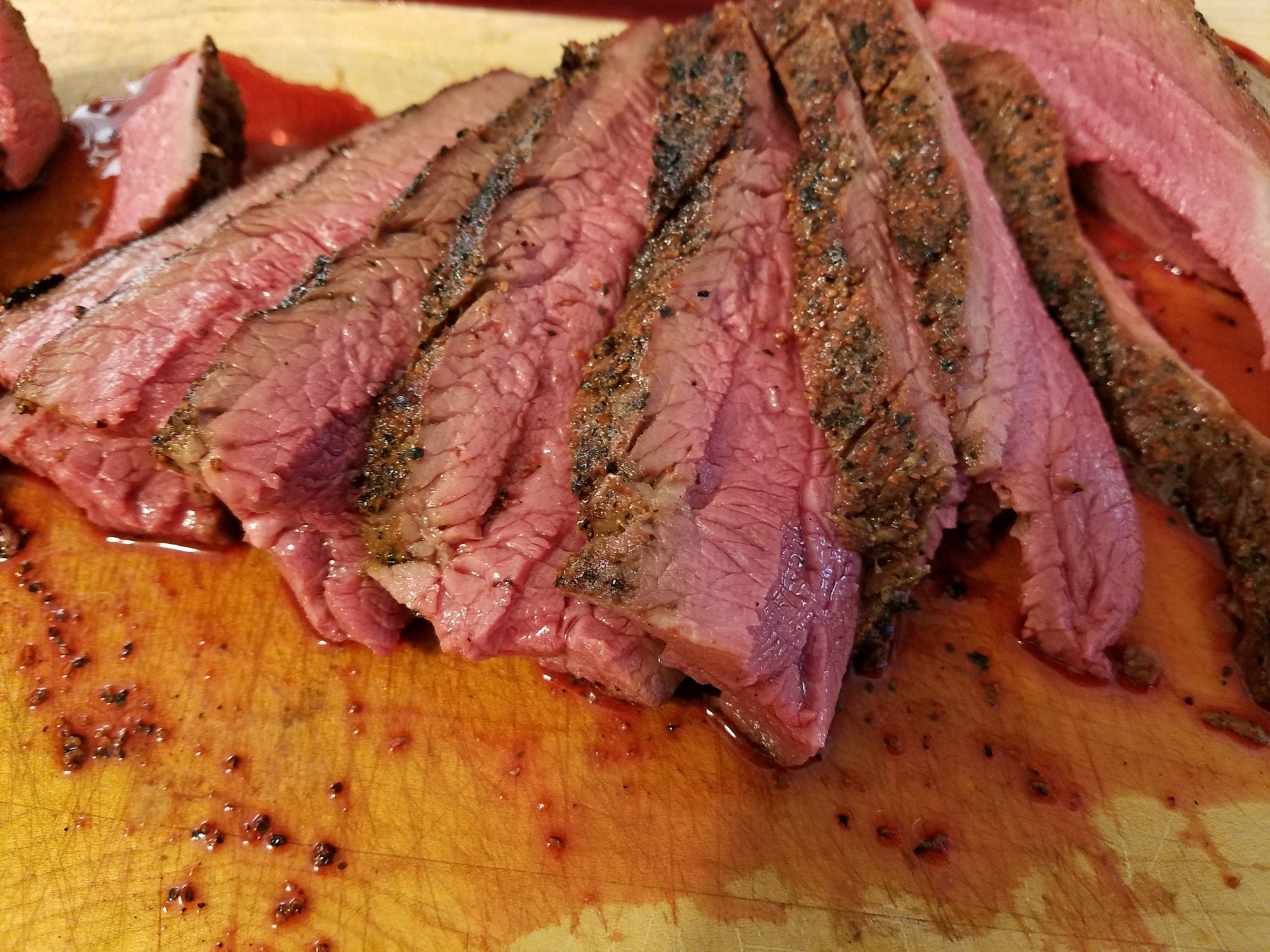 Coat both sides of the tri-tip roasts with the seasoning mixture, rubbing it in as you would a dry rub. Let the seasoned tri-tip rest for at least 30 minutes at room temperature. Sear each side of the tri-tip at 600 to 700 degrees for 3 to 4 minutes each. Remove seared tri-tip from the BGE, cover it with foil and let it rest while bringing the BGE temperature down to 350 to 400 degrees. During this cool down period I usually toss in a couple of oak chunks. Put tri-tip back in the BGE and cook to an internal temperature of 126 degrees for medium rare, basting with the sauce every 5 to 10 minutes. Remove tri-tip from the BGE, cover it with foil and let it rest 15 minutes. Cut into ½” slices against the grain.