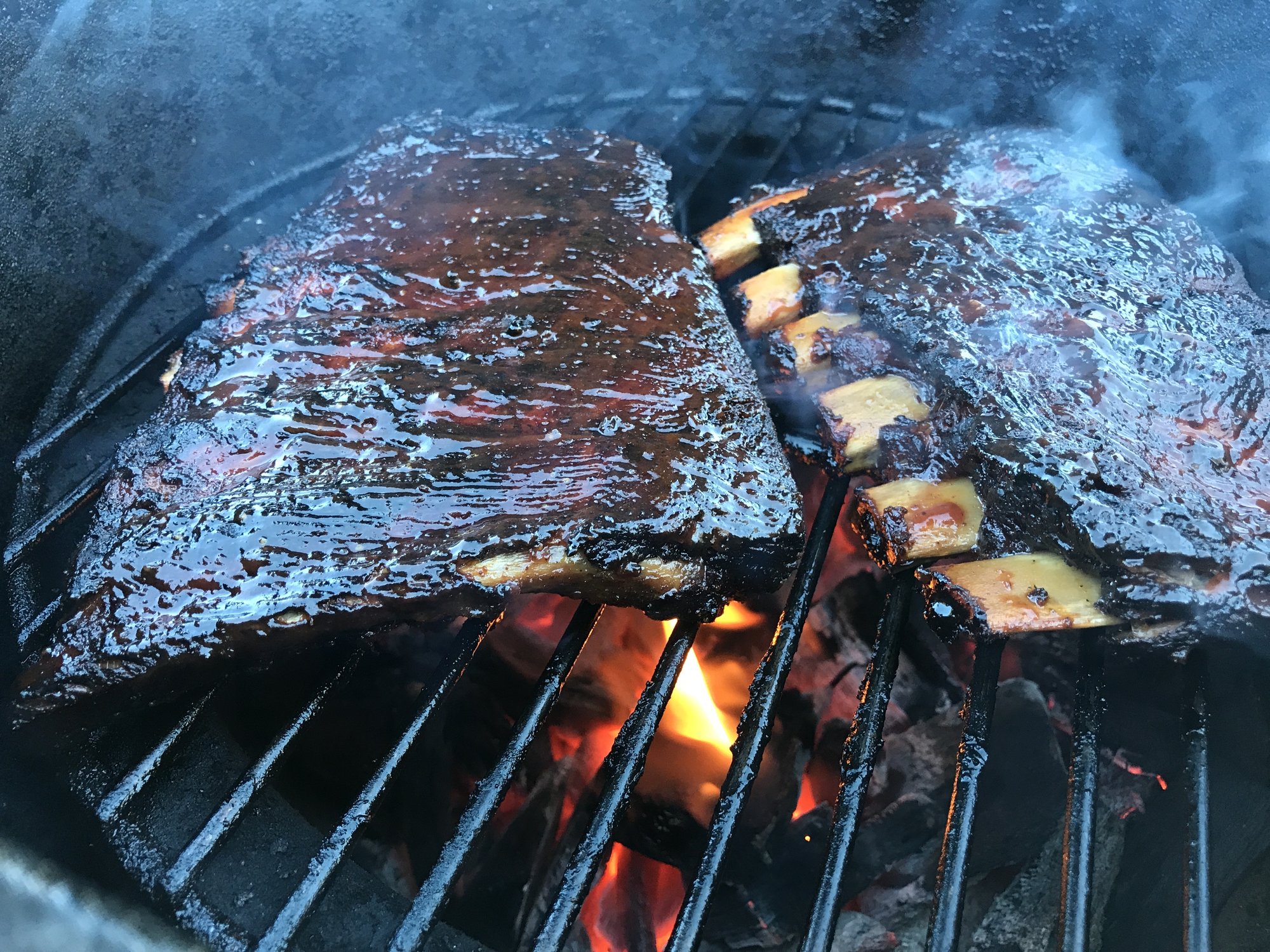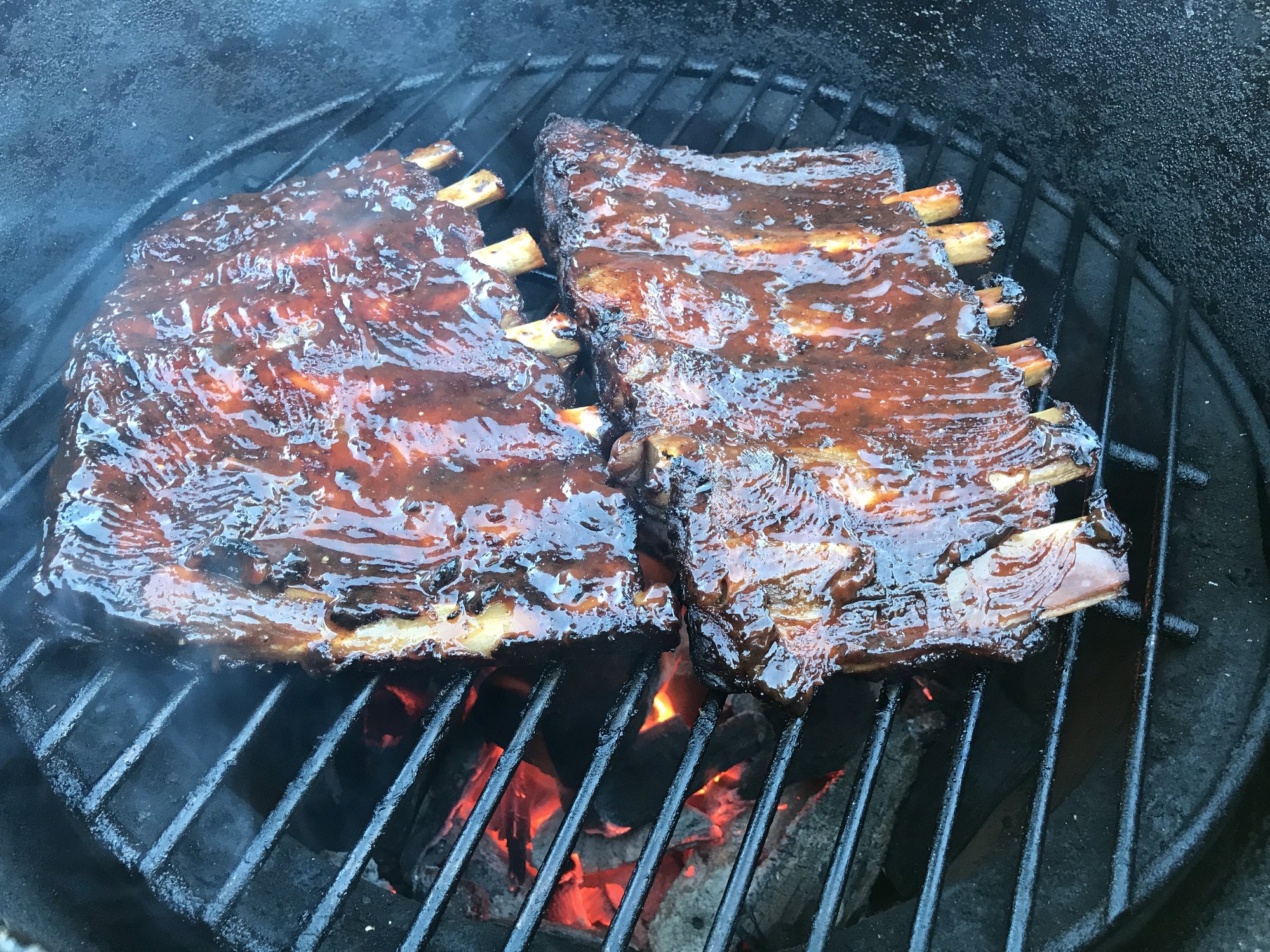 Smoked some ribs yesterday for the first time in a while. They were a hit. Used apple and cherry wood chunks and just did one rack on the MBGE. Verrrry tasty! Also made a batch of Myron Mixon's Hickory BBQ Sauce, which has quickly become my favorite BBQ sauce. So freakin' good. Here's some pics: