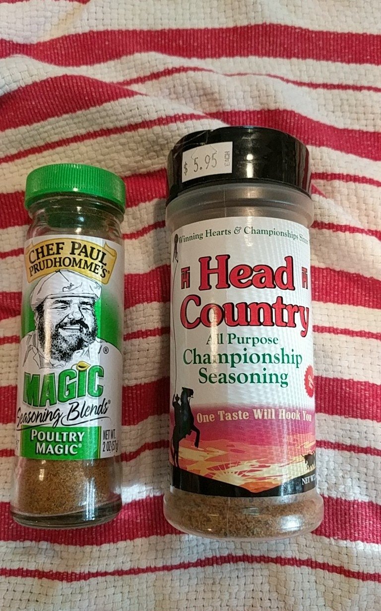 Wings were seasoned generously before going on the grill and that's as much prep as they received. Half got one spice mix and half got the other. Head Country is out of OKC.