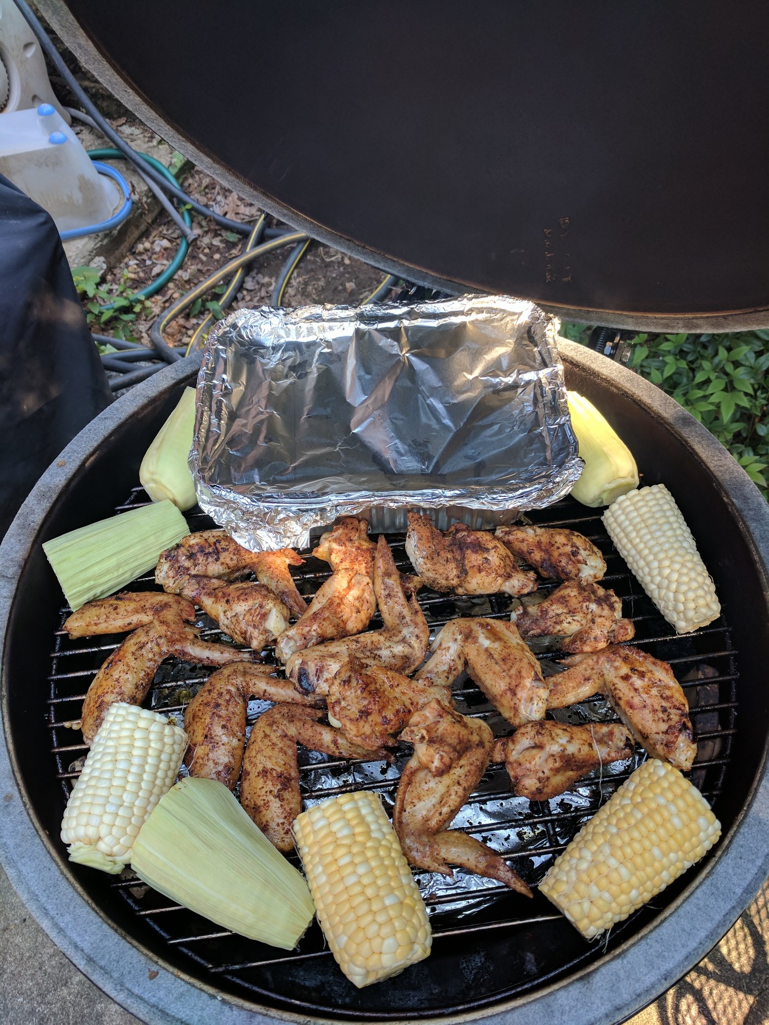 Chicken wings went on after the ends went into the pan, and corn on the cob followed later. Here she is all loaded up: