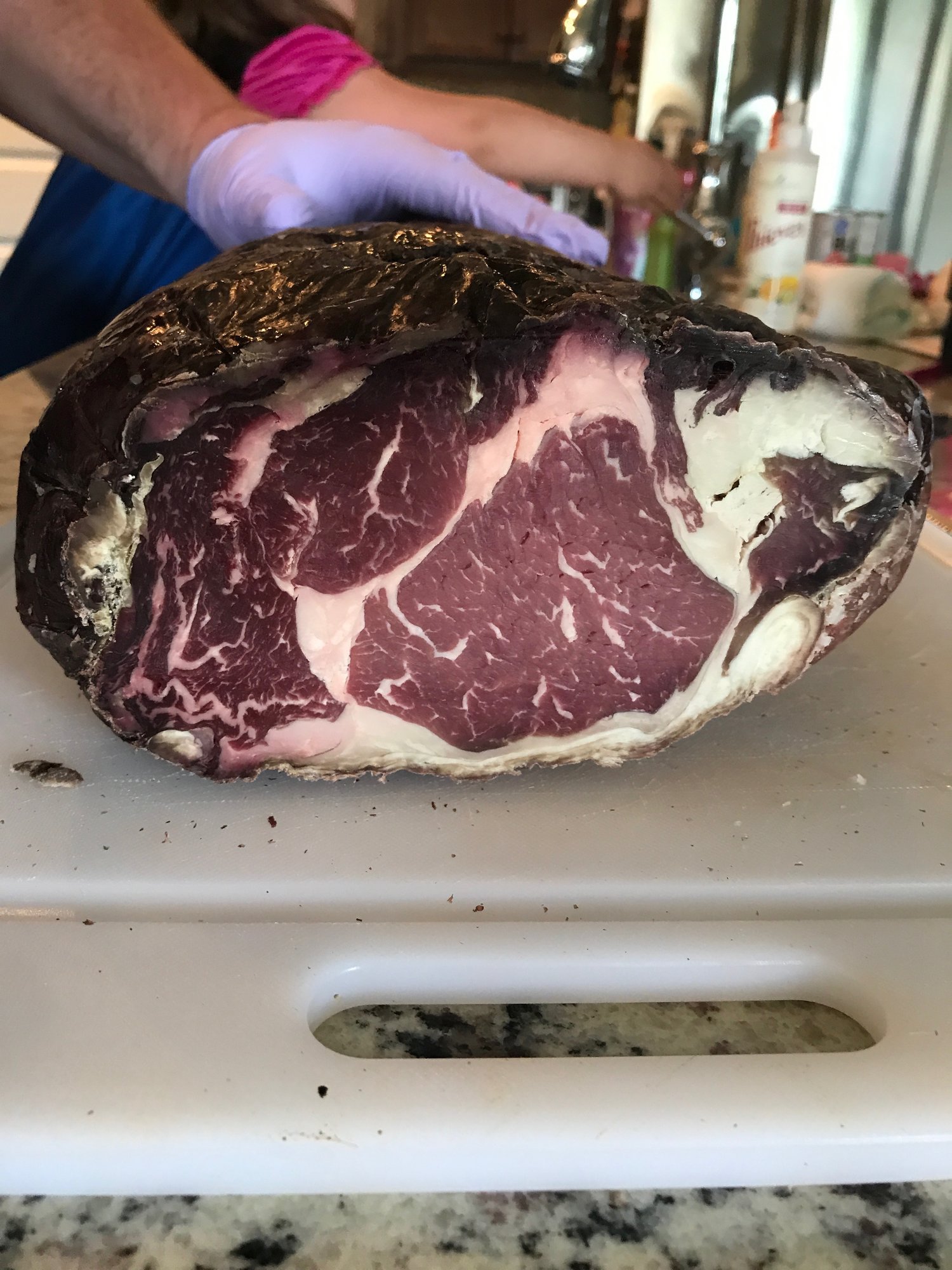 I dry aged a whole ribeye for fathers day and it would have been 45 then but 2 weeks of work trips popped up and it turned into a 60 day dry aging project. What better way to celebrate the 4th than some dry aged steak. reverse seared them and wow what a flavor. I have done 2 rounds of 45 days and think I like that a little better but the 60 day still was great. thanks for looking.