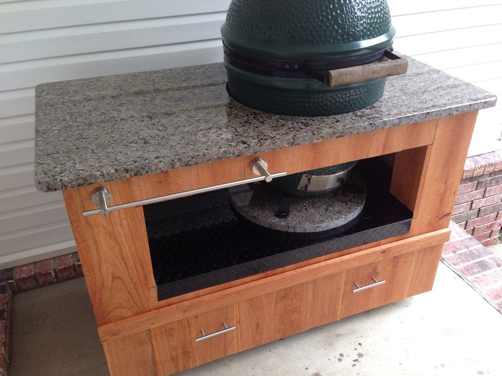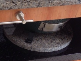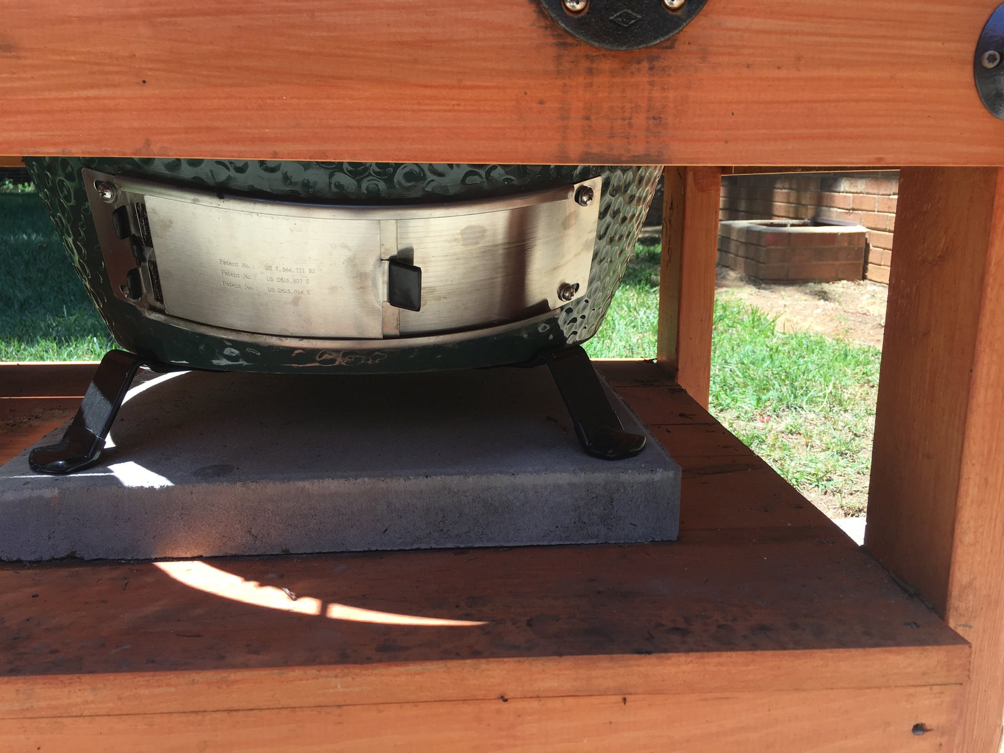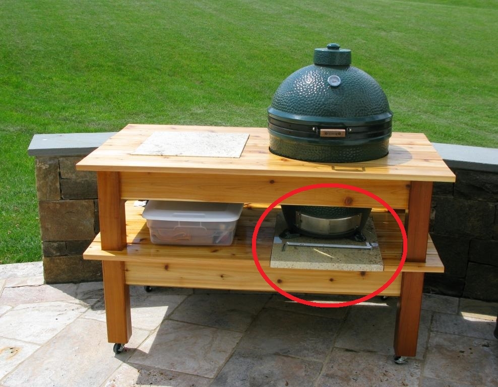 I bought a 20" piece of tile. Not granite but the same idea. It actually measures 19.5" on a side. It gives me a little over 2" around the base of the table nest. I actually have it offset so that I have very little overhang in back and most of the 4" in front of the bottom vent.