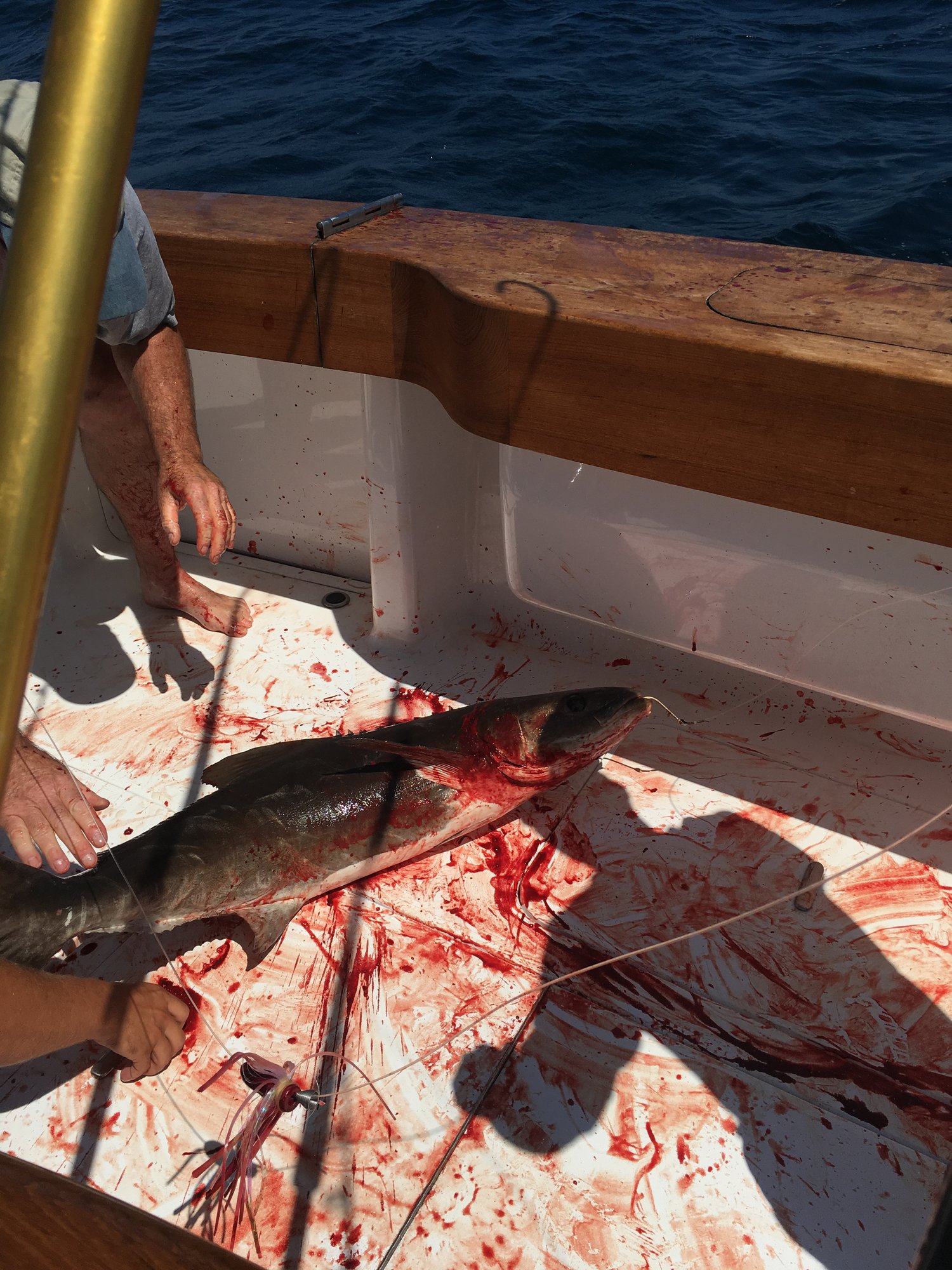 We were cruising back at 32 knots and about 1 mile out we saw a good splash/swirl about 200 yards straight off the bow. We always leave one ballyhoo rigged until we break the inlet on a spinning rod for situations like this. This time it paid off. The captain cut it back hard, mate flew up the tuna tower and spotted the likely cause of the splash. He yelled where and my buddy nailed the cast. He hooked the fish after twitching the rod a few times and we were on! The fish came to the boat fairly fast, and little did we know, green as could be. Gaff went in it and it came in the pit then went absolutely crazy for about 45 seconds to a minute. (Hence the bloody mess...) A cobia! This is a fairly rare fish in NJ and the first one any of us ever caught here on any of our boats. Needless to say, we were pumped. Weight was 34.6 lbs.
