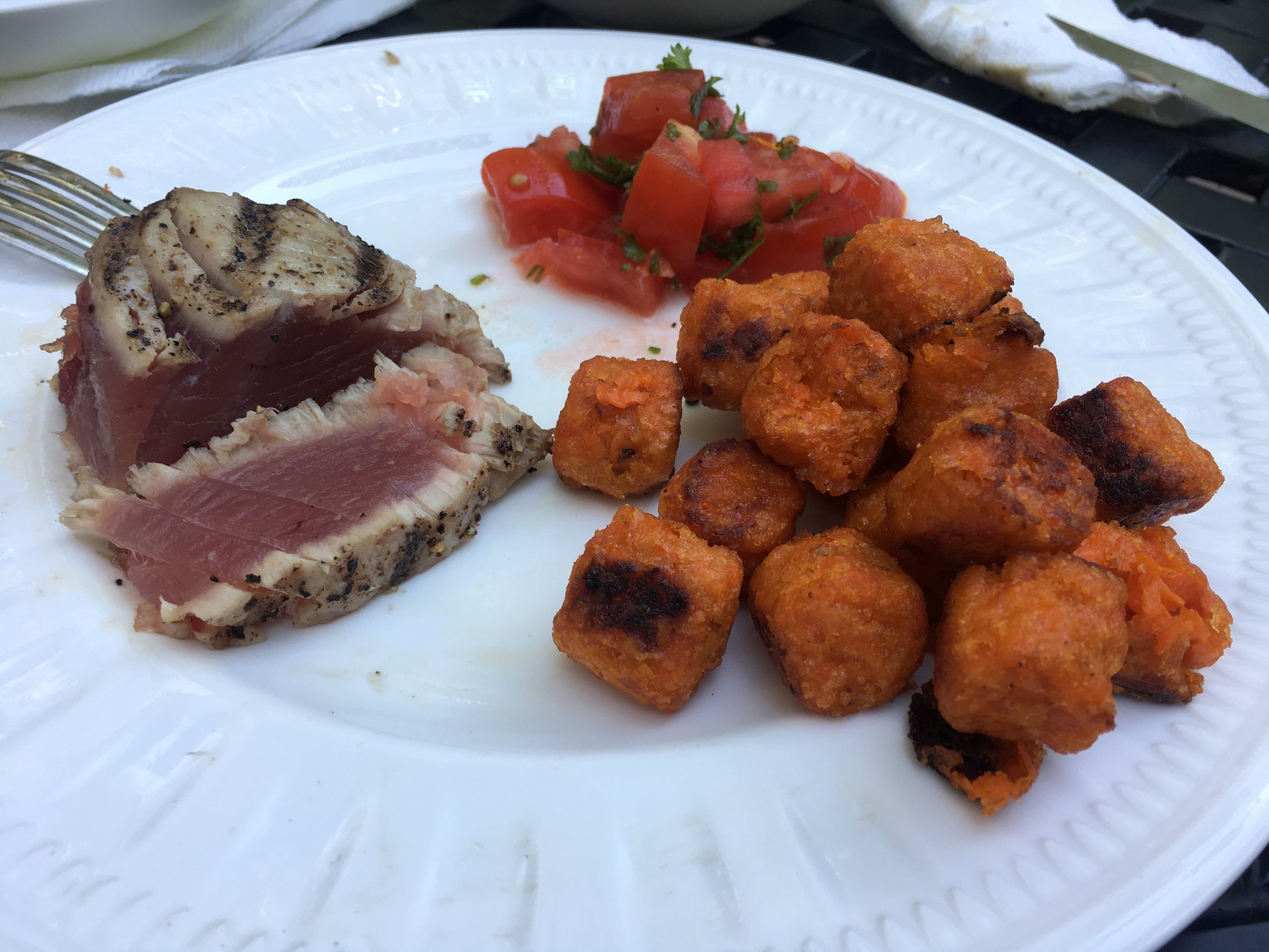 Awesome looking catch and experience. I'm on a big tuna kick lately and that looks perfect. Are those sweet potato tots with it?