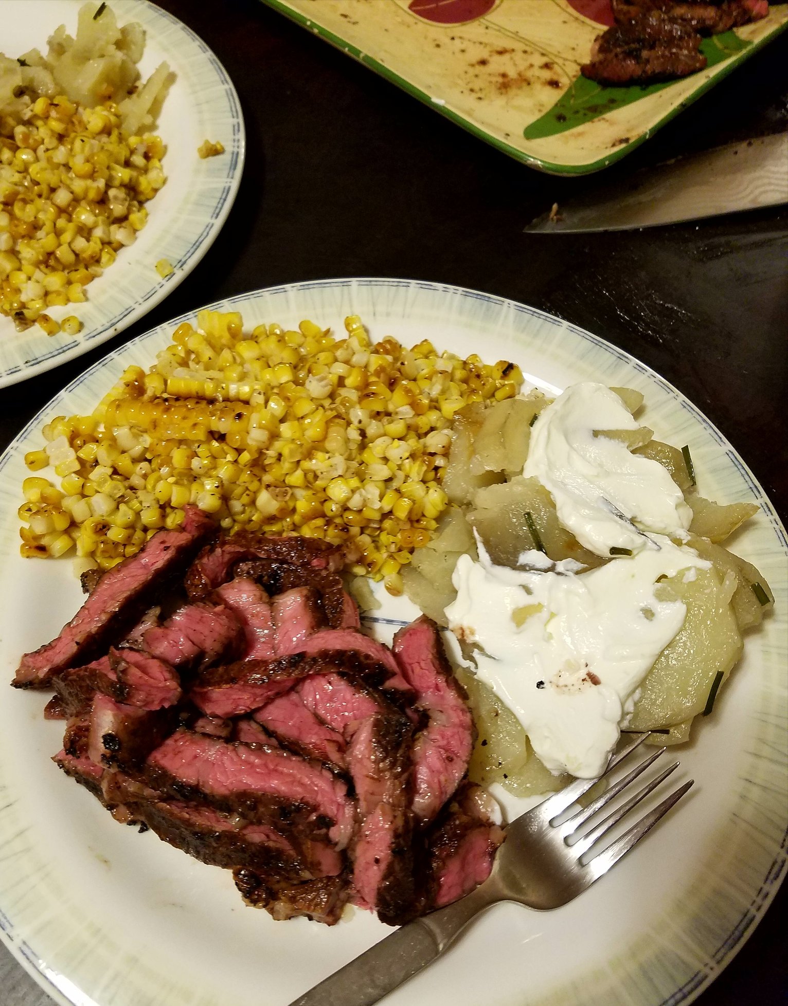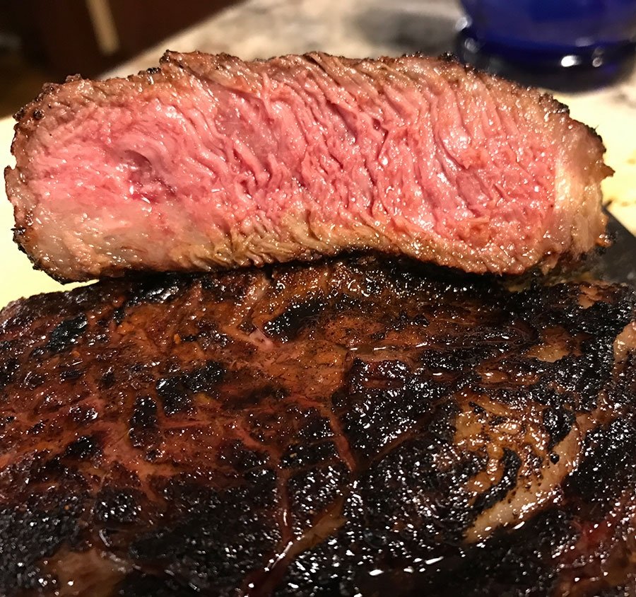 WOW, @Focker's thin ribeyes look WONDERFUL! Deep char, almost entirely pink interior... Masterful job, sir!!!