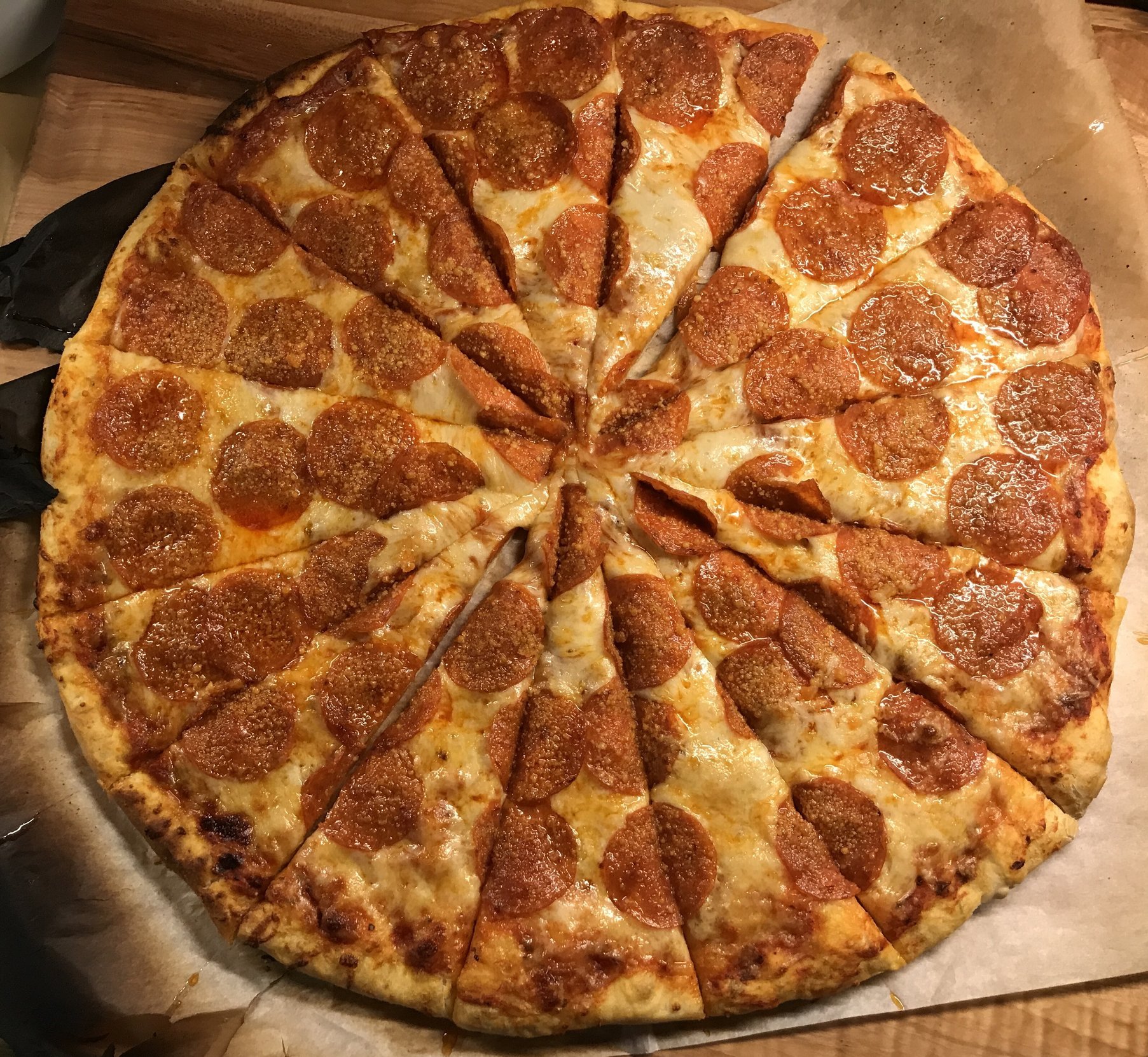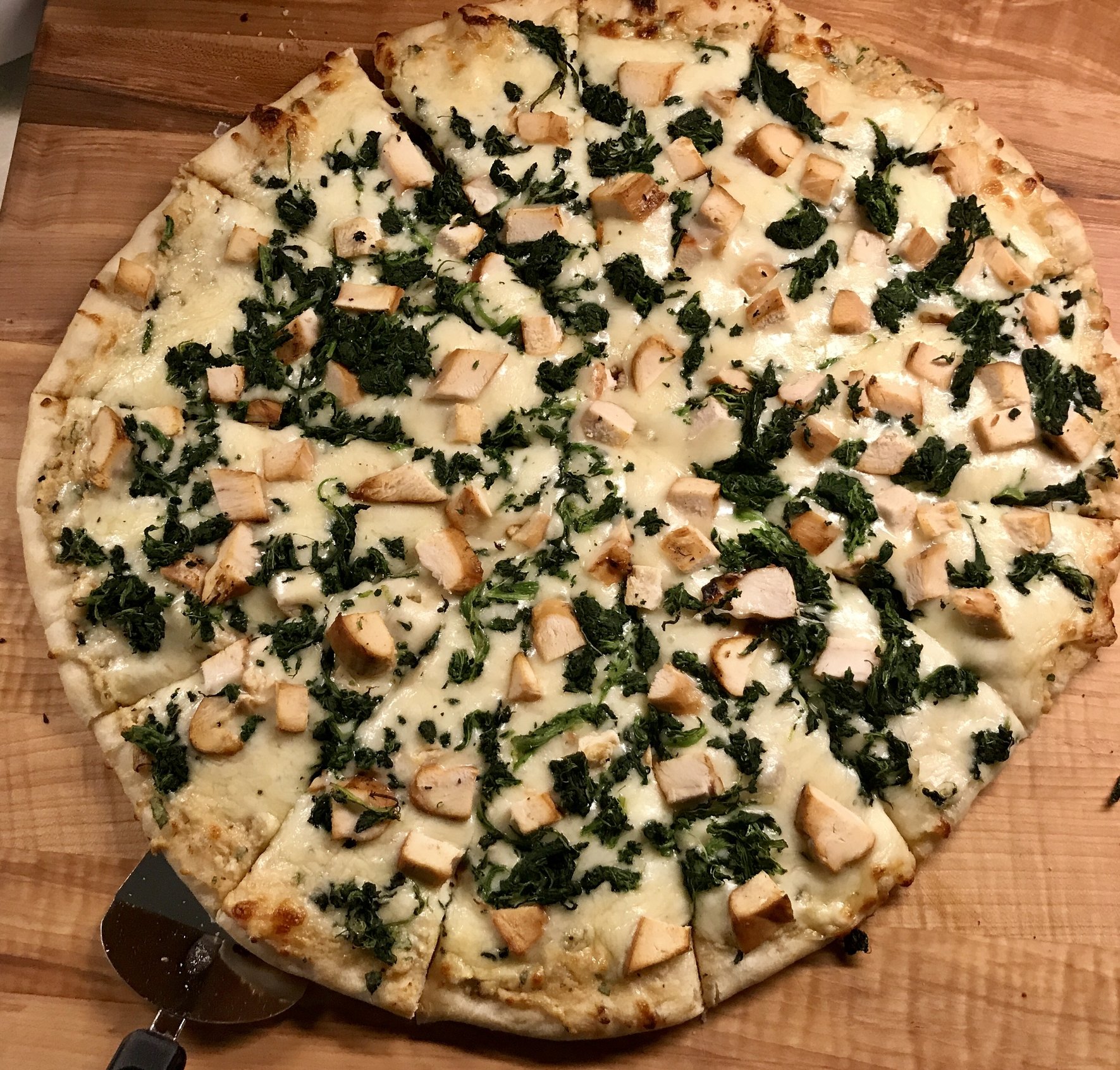 Here are a couple of pies we did last week.  The one is obviously pepperoni, the other is a roasted garlic & ricotta with chicken and spinach.  The roasted garlic one is my new fave.  If subsequent pizzas are burning or cooking too quickly try wiping the stone with a damp rag between pizzas.  This will lower the temp of the stone a bit.  My set up is PS with legs down.  3 firebricks oriented horizontally with the pizza stone on top of the bricks.  Pizzas were cooked at 550 degrees for 5-6 minutes.  I use parchment paper on an airbake pizza pan to transfer the uncooked pizzas to the stone.  This works for me because the pizzas are bigger than my peel.  The peel works great for removing the pizzas from the stone once the dough is cooked.
