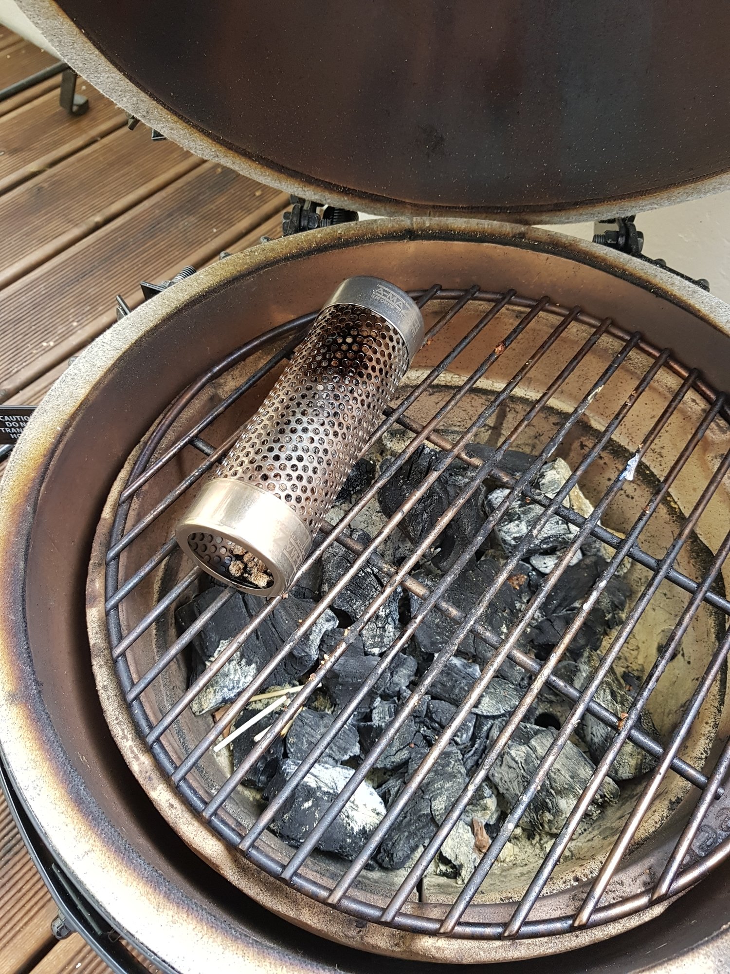 Did the cold smoke in addition because I didn't get satisfactory smoke while hot smoking with apple wood chips. Seems like I have to work on the amounts and placing of the chips. On such low temps there's only parts of the charcoal on fire and need to get the wood chips close to the heat. Also had problems lighting the charcoal, got better charcoal, big lumps, but they are a bit harder to light with starter cubes.