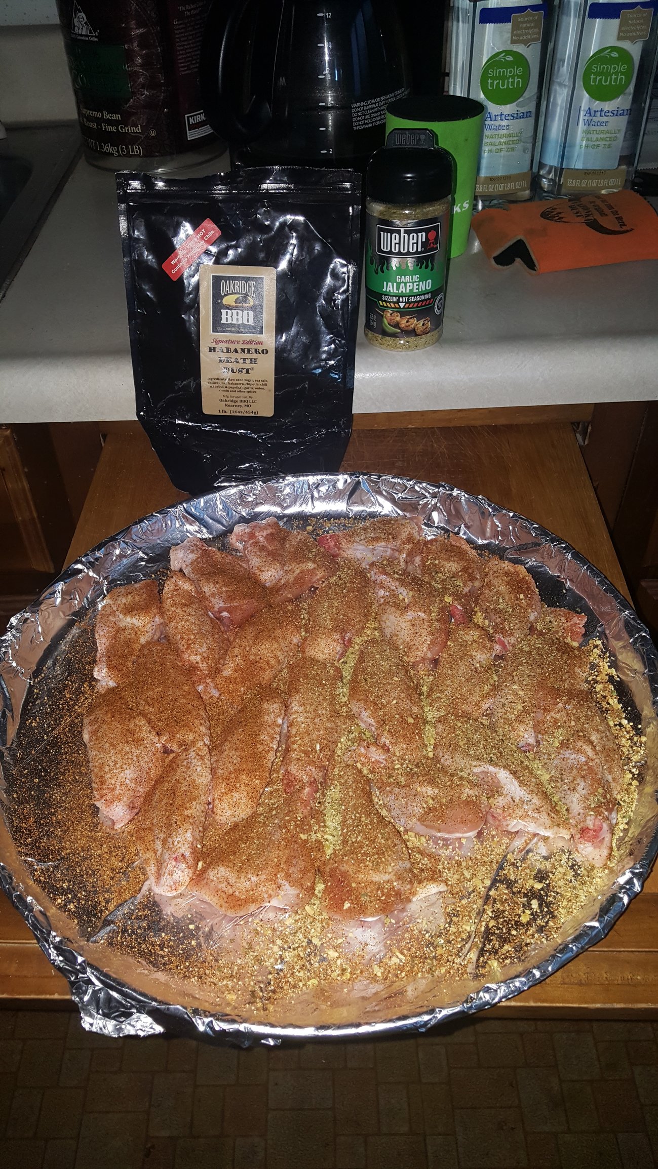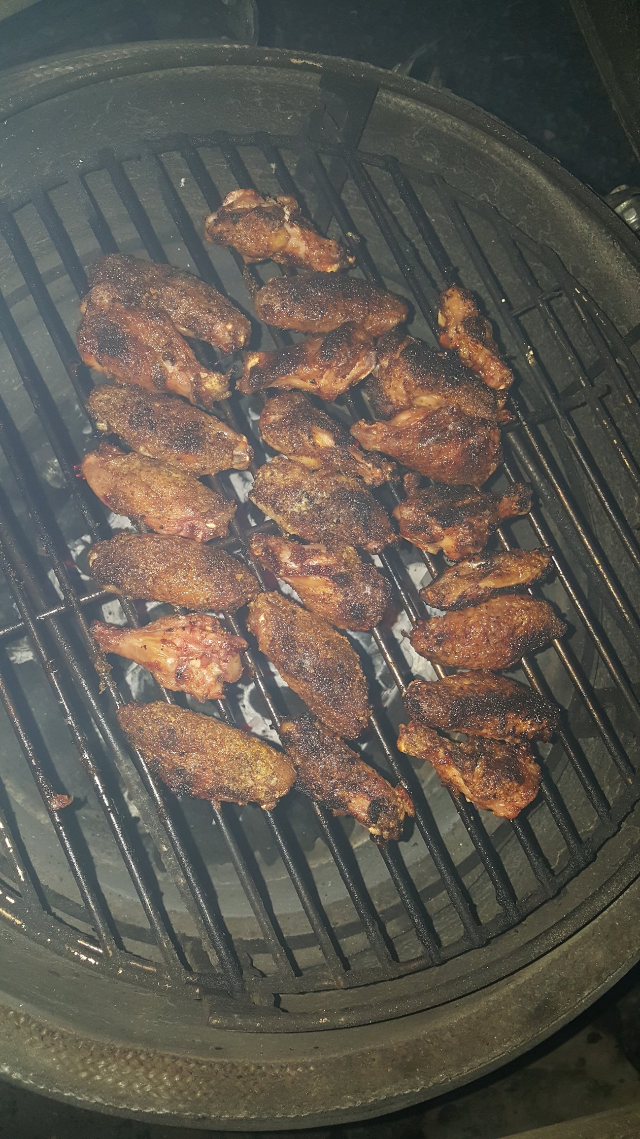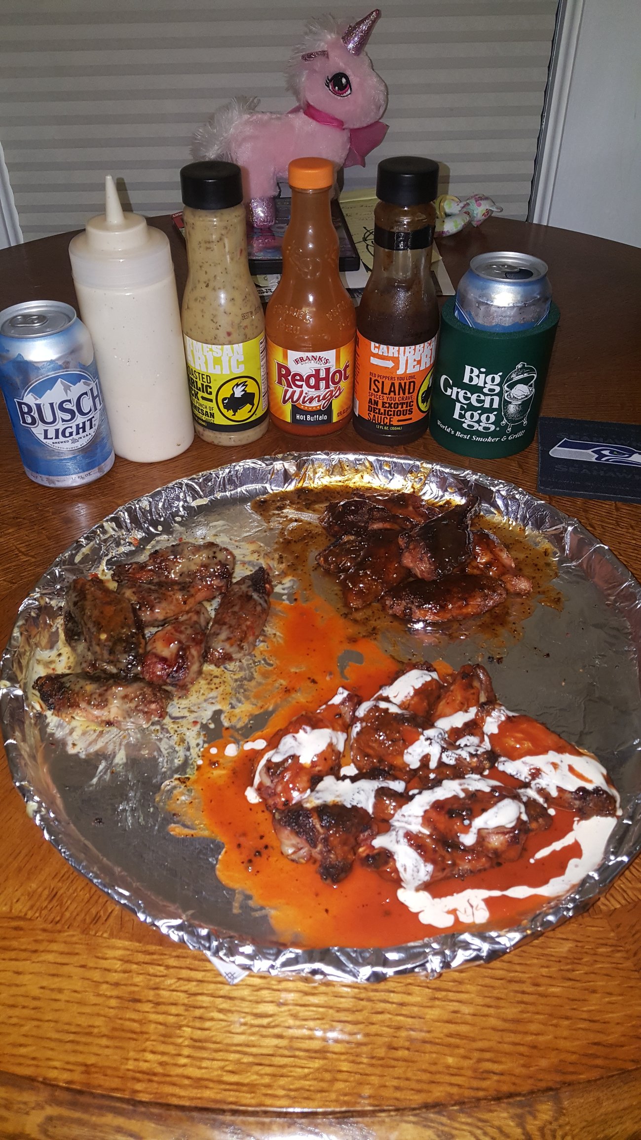 My contribution, started with 2 packages of Ranger " air chilled" wings, applied @OakridgeBBQ Habanero Death Dust on all and added Weber garlic jalapeno on half and did the corn starch trick. Set the Egg up direct with my AR at °350 and cooked for about an hour. Pulled and sauced with 3 different sauces then Alabama white sauce. Turned out nice and crispy. Also a couple of Busch Lights to keep the heat down.