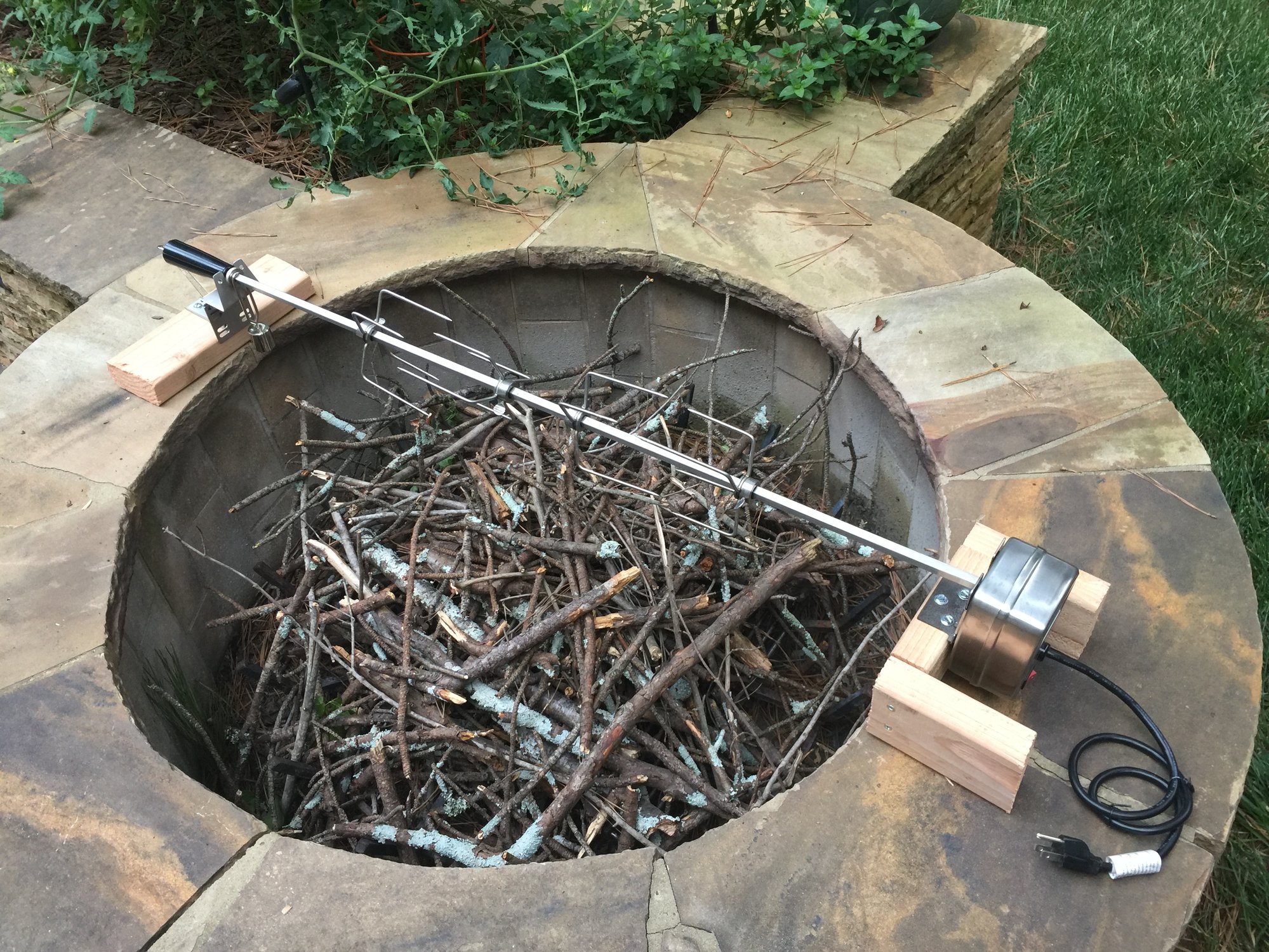 So this evening I was bored, the kids were outside riding bikes, so I decided to build an open pit rotisserie setup using my outdoor fire pit.  I had 2 rules, (1) using materials I could find in the gararage, i.e. no trips to Home Depot and (2) it had to be removable, something I could break down when not in use.  I had the rotisserie setup from an old gasser, that we discarded once we got the BGE, which I repurposed. I built a simple stand for the motor using brackets and a 2x4. Probably not a good idea to use wood, but that's what I had...lol. We will see if it catches fire. (I might have to rethink this). I probably will have to get a few bricks to elevate it a bit. Anyway here is my ghetto (no trips to the hardware store) rotisserie setup!