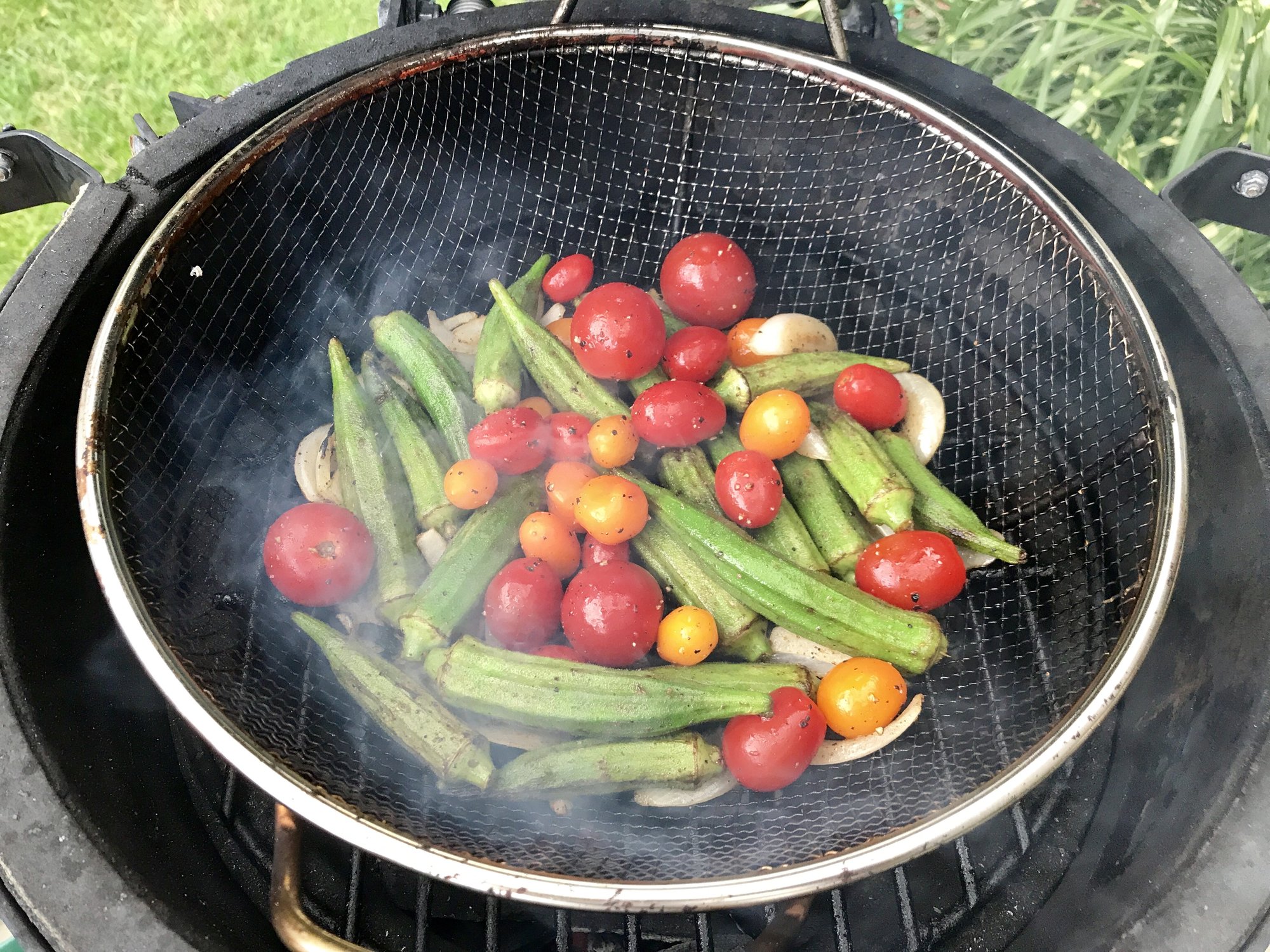 Fresh Okra, onions and mini maters with EVOO and a Cajun spice in the basket on the small at 500° direct The maters went on about 10 mins after the Okra and onions got a head start and cooked for maybe 7mins until they started popping open.