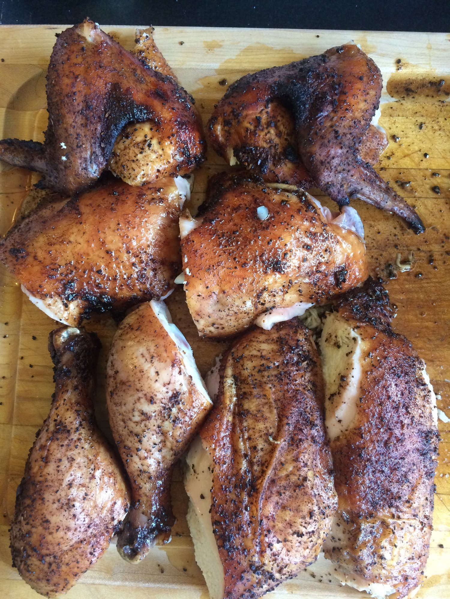 Great job.  I love cherry smoke on chicken.  Have you tried letting it go a little bit longer and pulled instead of cutting into sections?  That's my goto for smoked chicken.