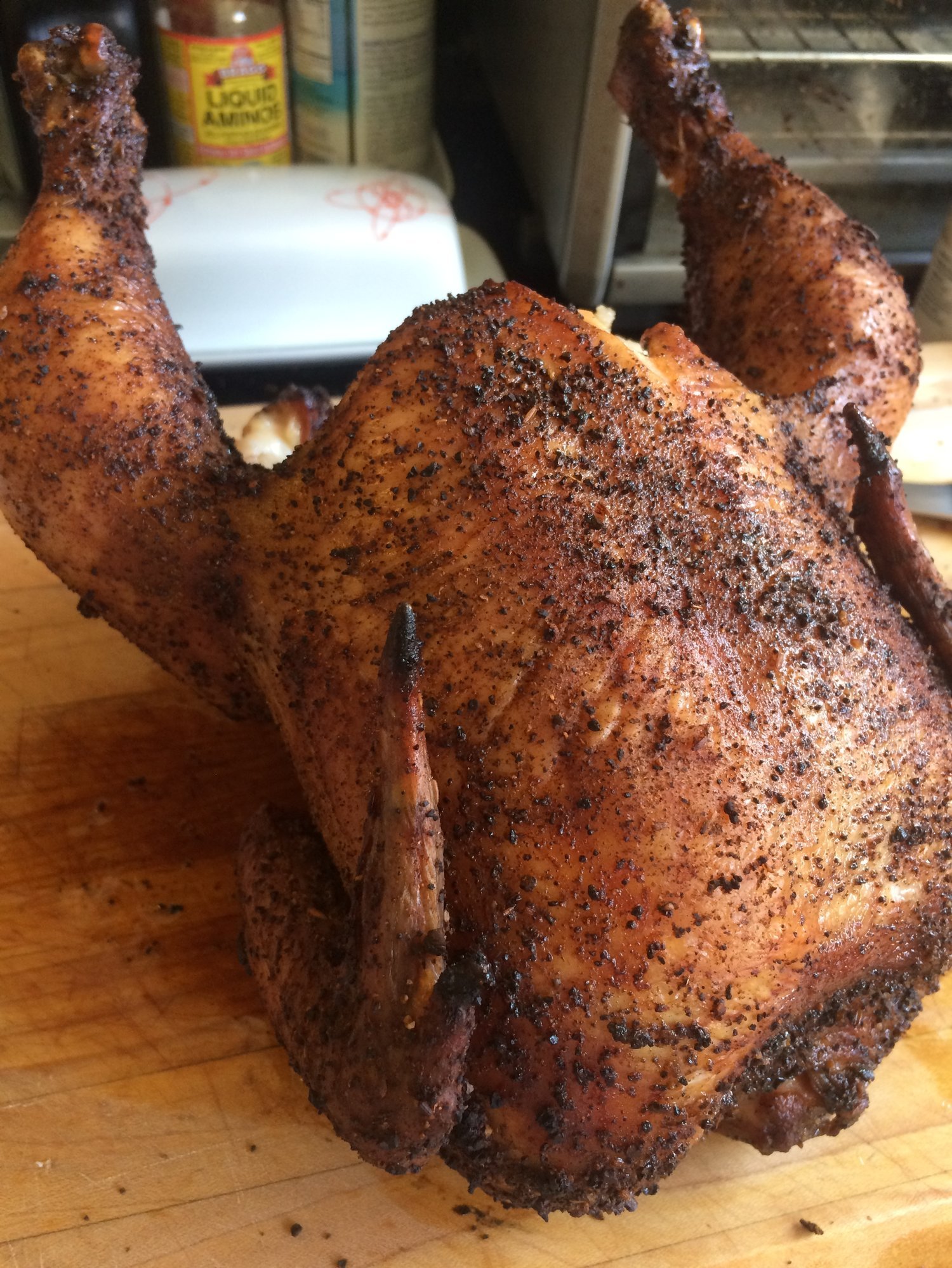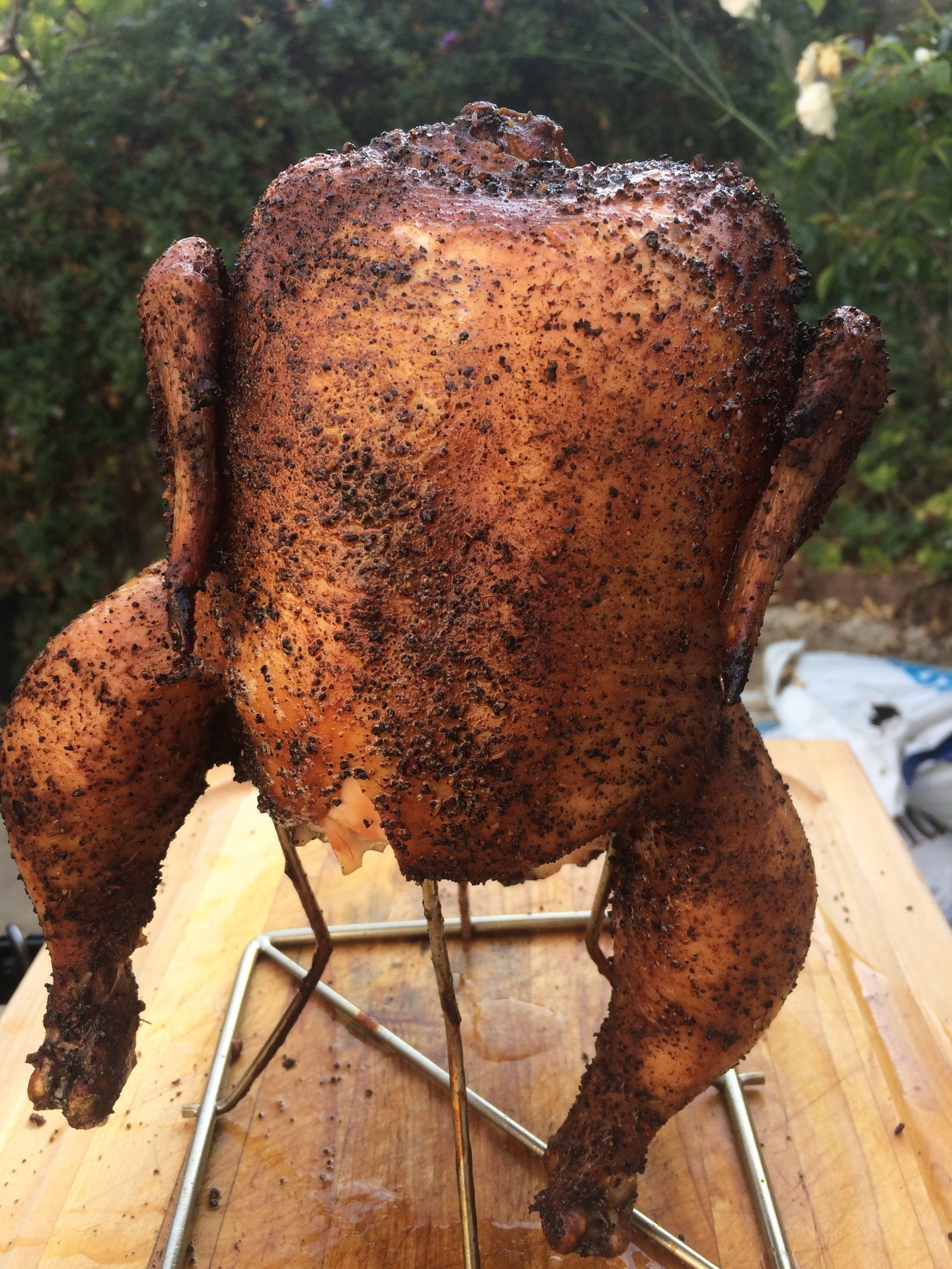 This was my first try smoking a chicken. I did read about the possibility of a pulled chicken, but I was skeptical--does chicken really have enough collagen to break down in that way? Interesting. Thanks for the compliment!