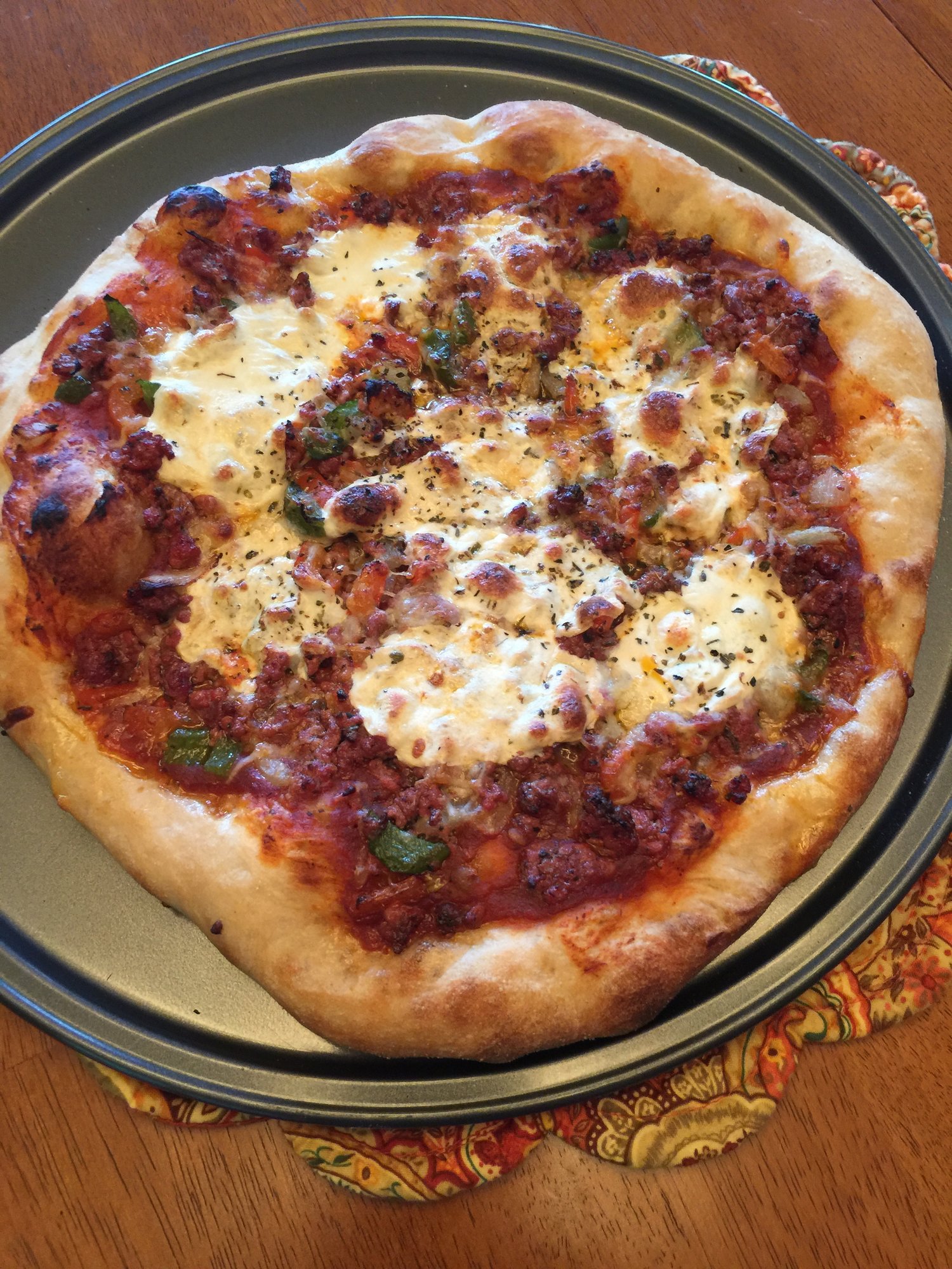Ground beef, red and green peppers, sweet onions, Fresh mozzarella, shredded five cheese mix and pizza sauce.