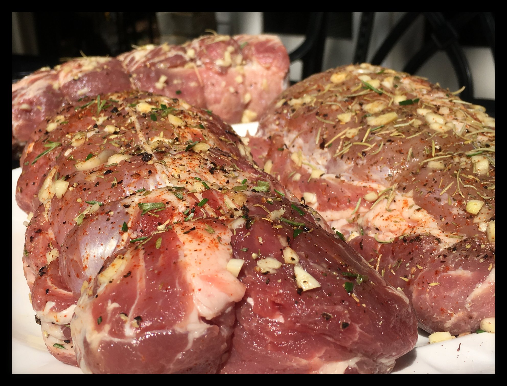 Salt, pepper, rosemary, cayanne pepper, thyme. Served with hassleback potato, garden salad, and Kings Hawaiian rolls. No plated pic because there were 18 people and you know how taking pictures goes over when they are at the table....