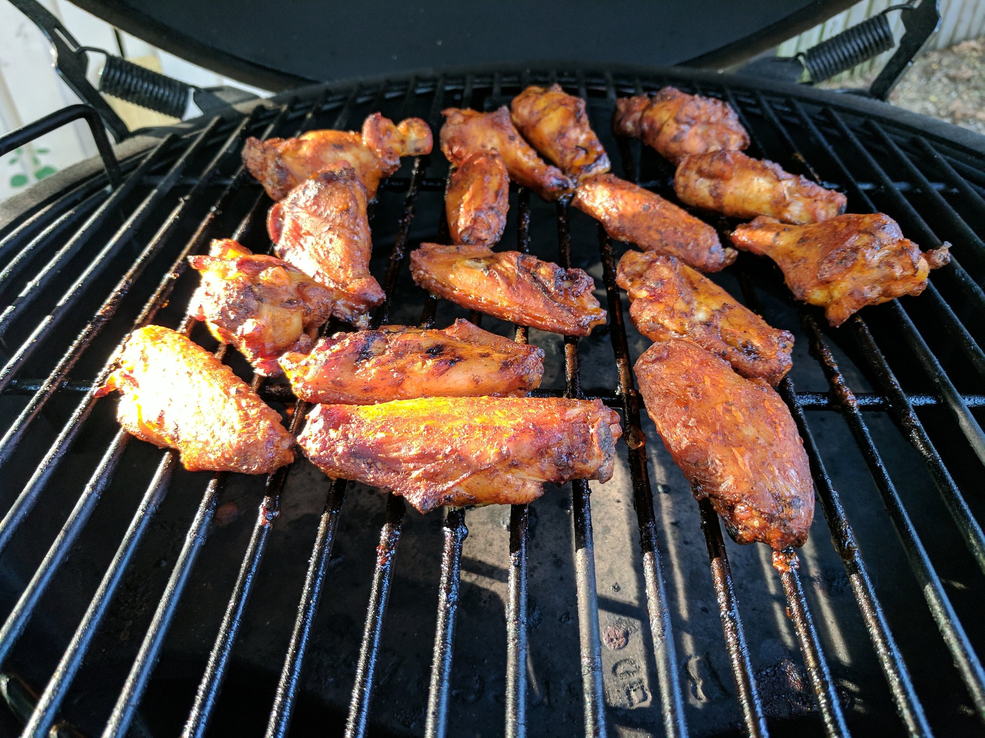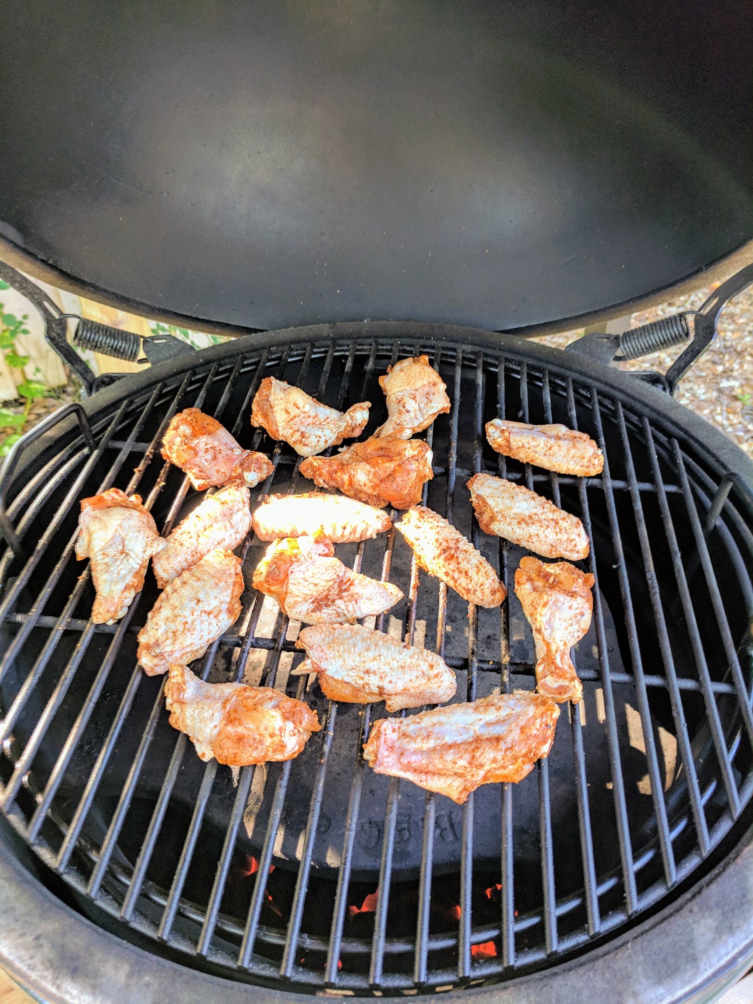 The weather held up here in Central Florida (usually raining every time I wanna egg in the early evening) so decided on some wings. I did not set them out overnight uncovered in the fridge to dry out so was a bit concerned, however I separated them, threw them in a zip loc bag with some DP Mole, and fired up the egg. Used the 30-20-10 at 375 indirect method found here in this forum (sorry but didn't remember which post I got it from) and they turned out perfect. Skin was crisp and the meat was moist. No pics of the plating, they were devoured as soon as they were brought in.