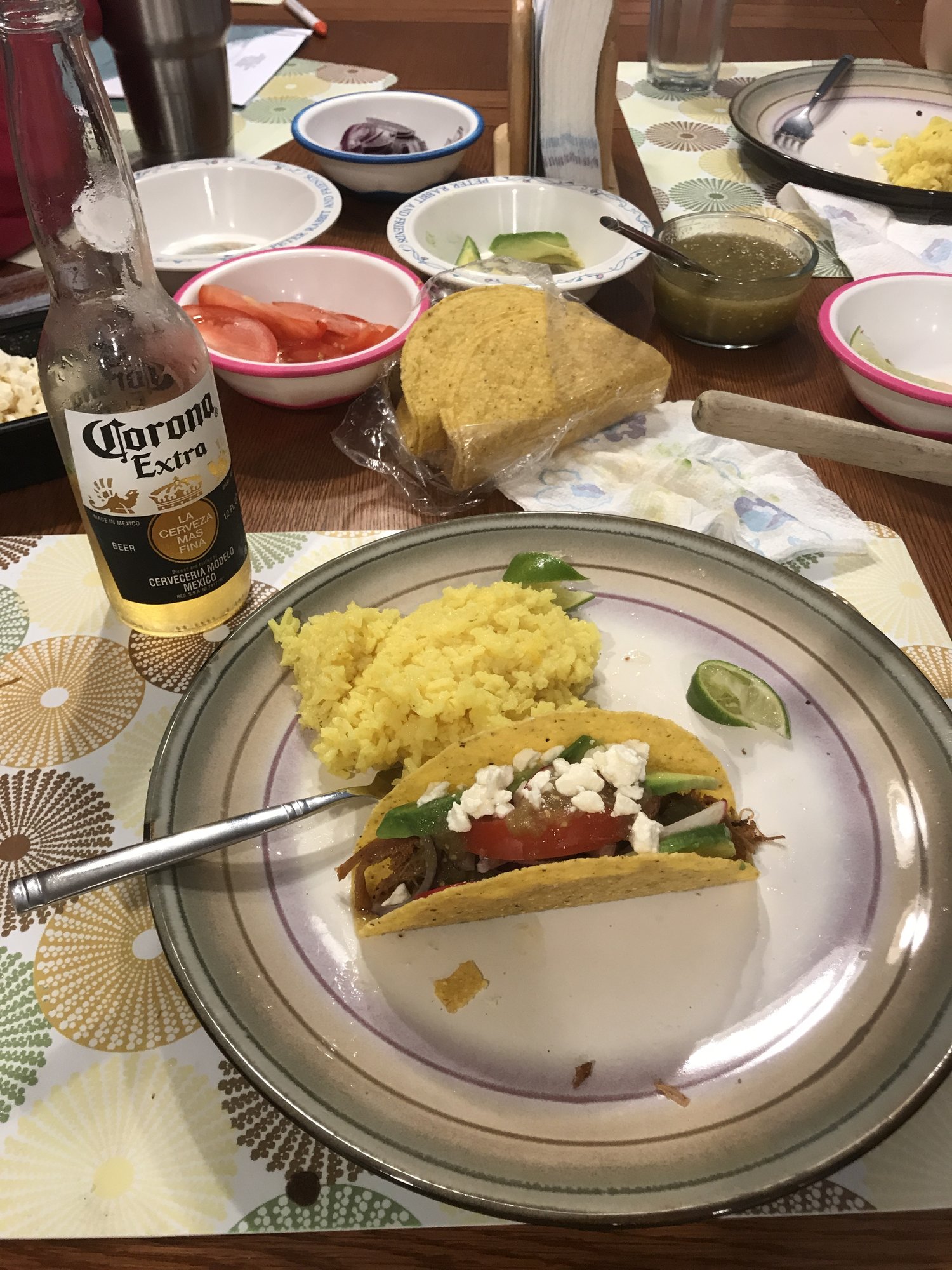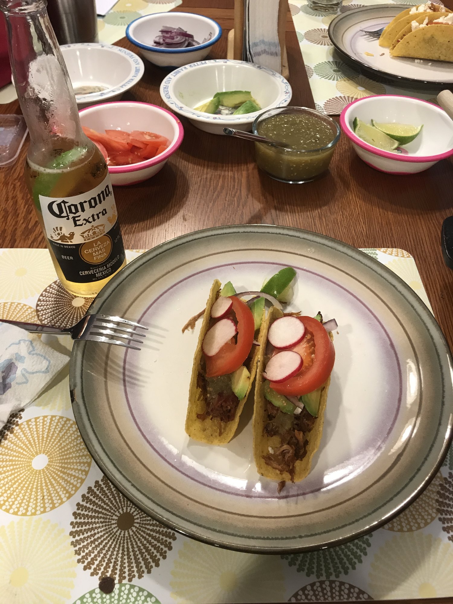 Tacos made from leftover pulled pork with radishes, tomato, onion, avocado, feta cheese, and salsa verde with yellow rice on the side - washed down with a couple Coronas - makes for an outstanding meal. Unfortunately I couldn't find Queso Fresco anywhere nearby.