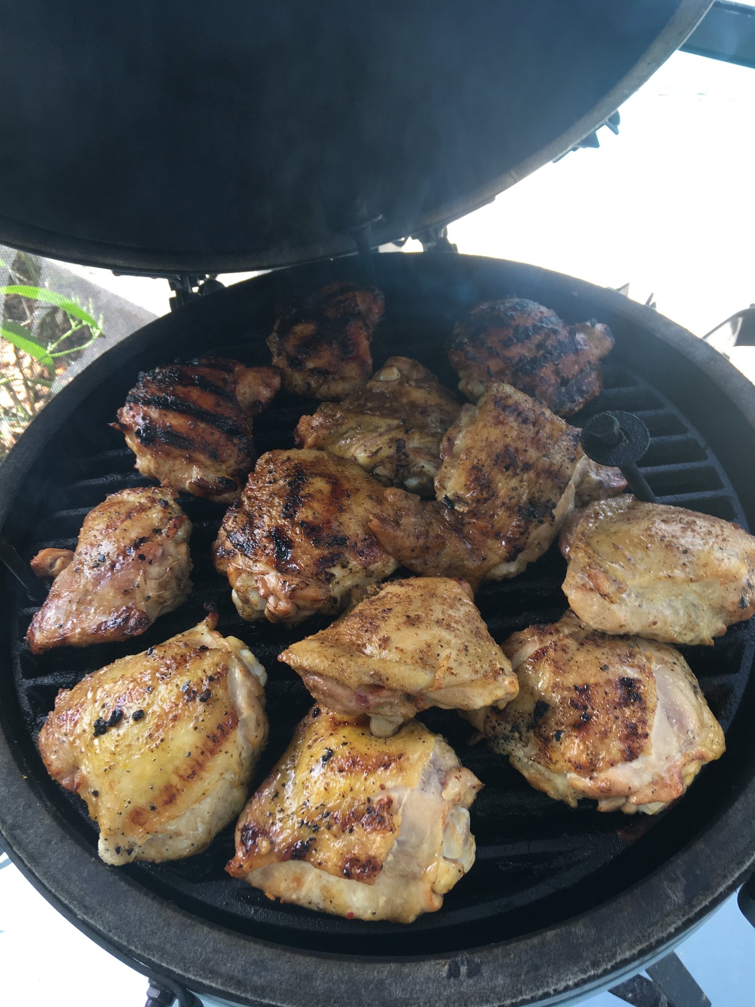 Today I am grilling bone in thighs, with baked potatoes, stuffed shrooms, and grilled asparagus.Usually I get the sides done first, since they take the longest to cook, but since I had help with my prep, I put the chicken on first.