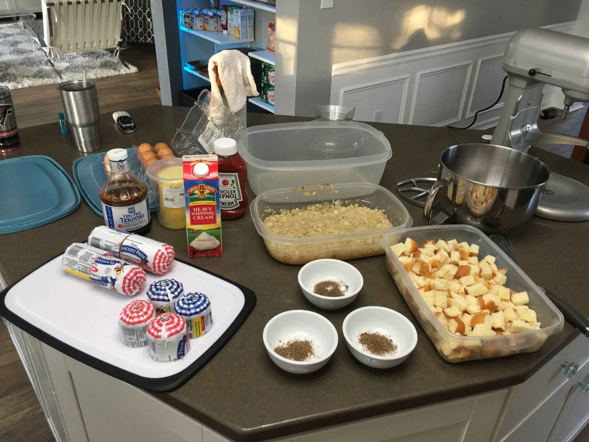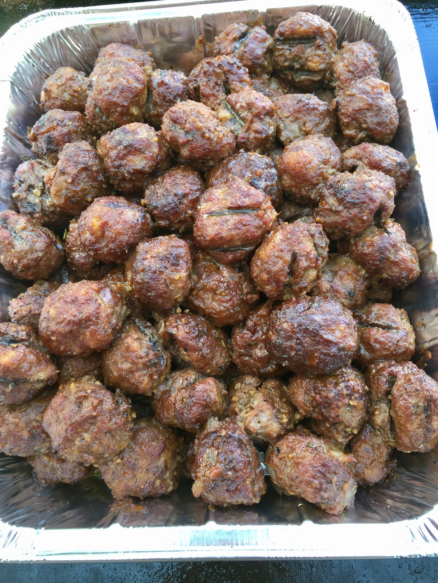 Lots of meatballs about to go in the backwoods over peach and Apple. Luau themed pool party in the hood today doing pineapple teriyaki glaze. Double ground a prime brisket mixed with Tennessee pride hot and mild sausage and other stuff. Basically a meatloaf.