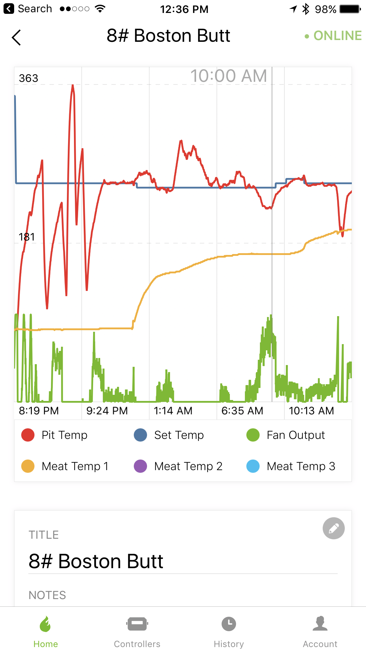 Here's the most interesting thing (to me, anyway): look at the graph below and note that when the meat was about to come out of the stall at 10:00 AM, the temp dropped in the egg. Coincidence? I'm guessing not. I also wonder why the overnight temp spiked a few times. I didn't open the egg until 12:30.