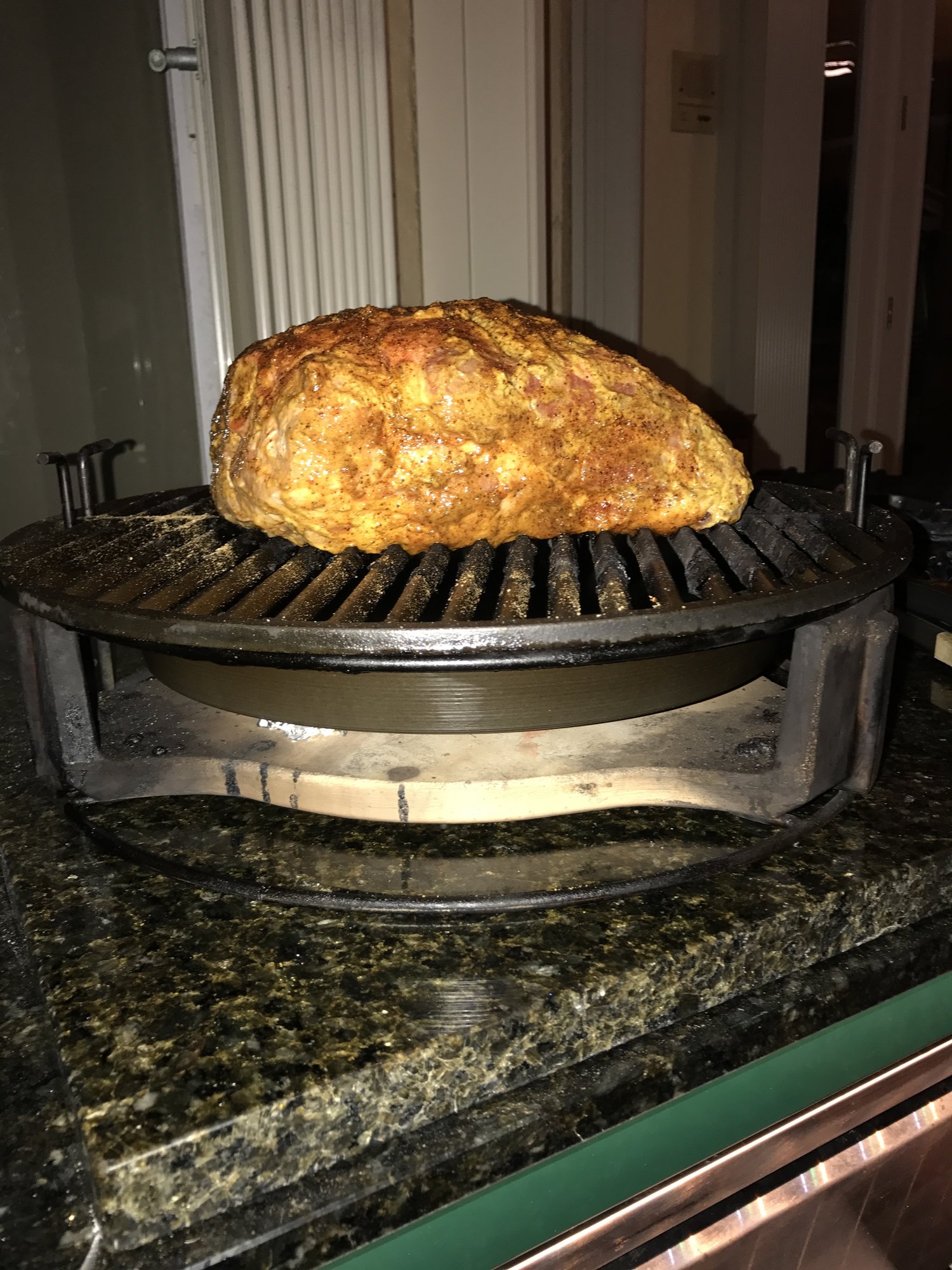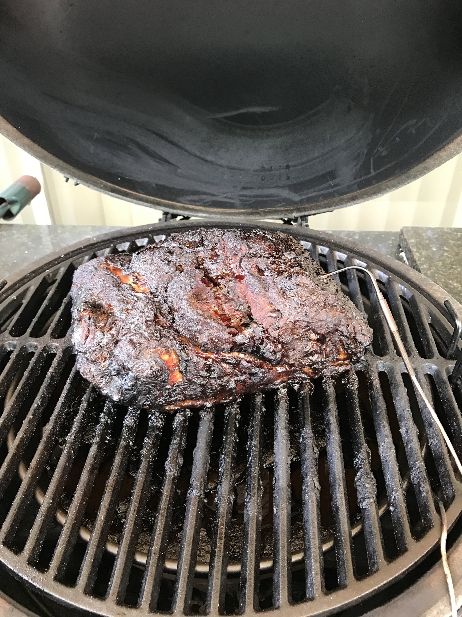 Went on the egg at 9:30 last night fat side down on a CI grid on the PS Woo with a Lloyd Pans pizza pan for a drip tray. Used hickory and cherry chunks. Cheated and used my FlameBoss to maintain temps.