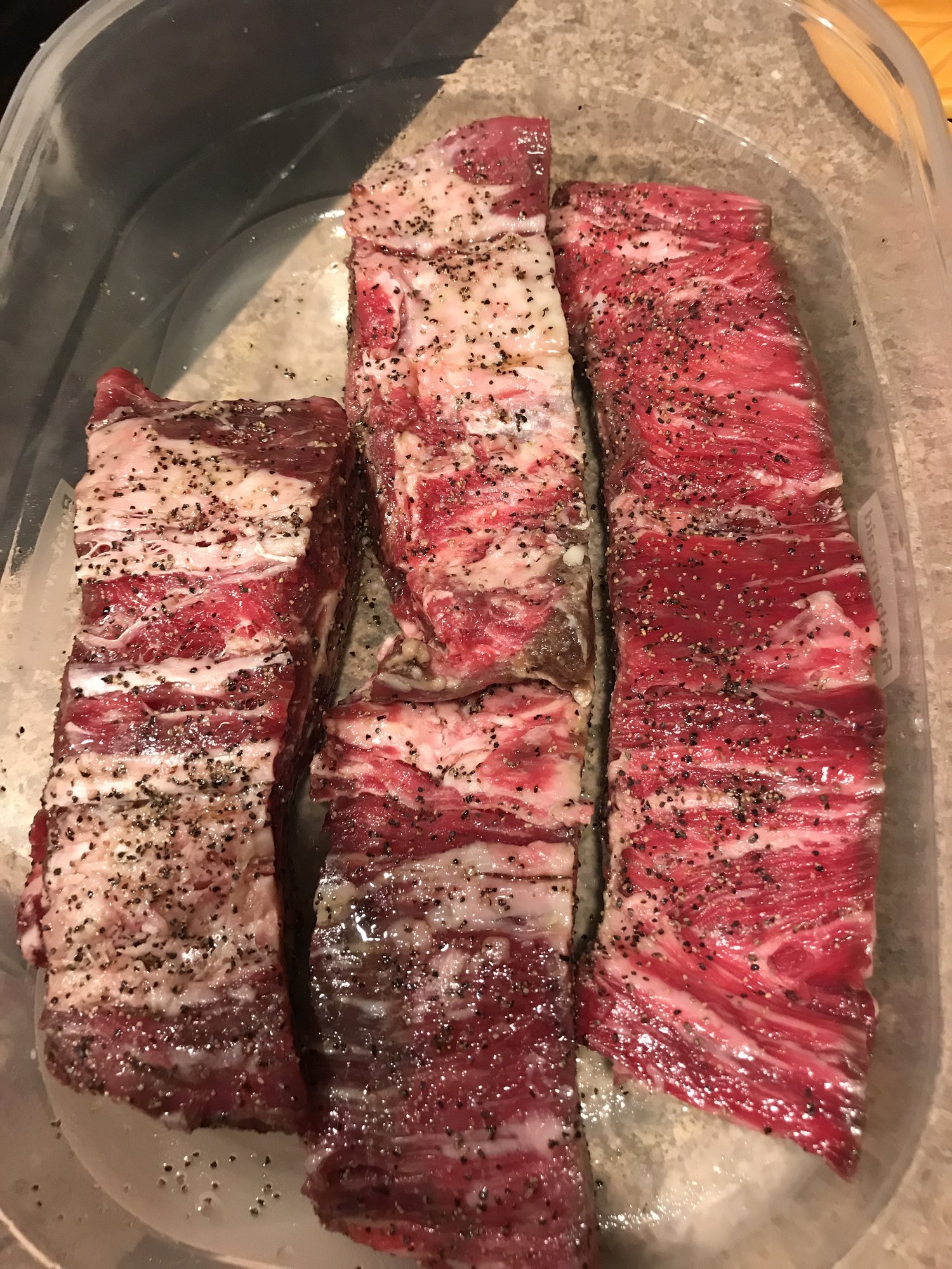 Picked-up prime cap steaks at Costco, unwound them, seasoned with evoo, kosher salt, and course ground black pepper. Waiting for the Egg temp to come up.