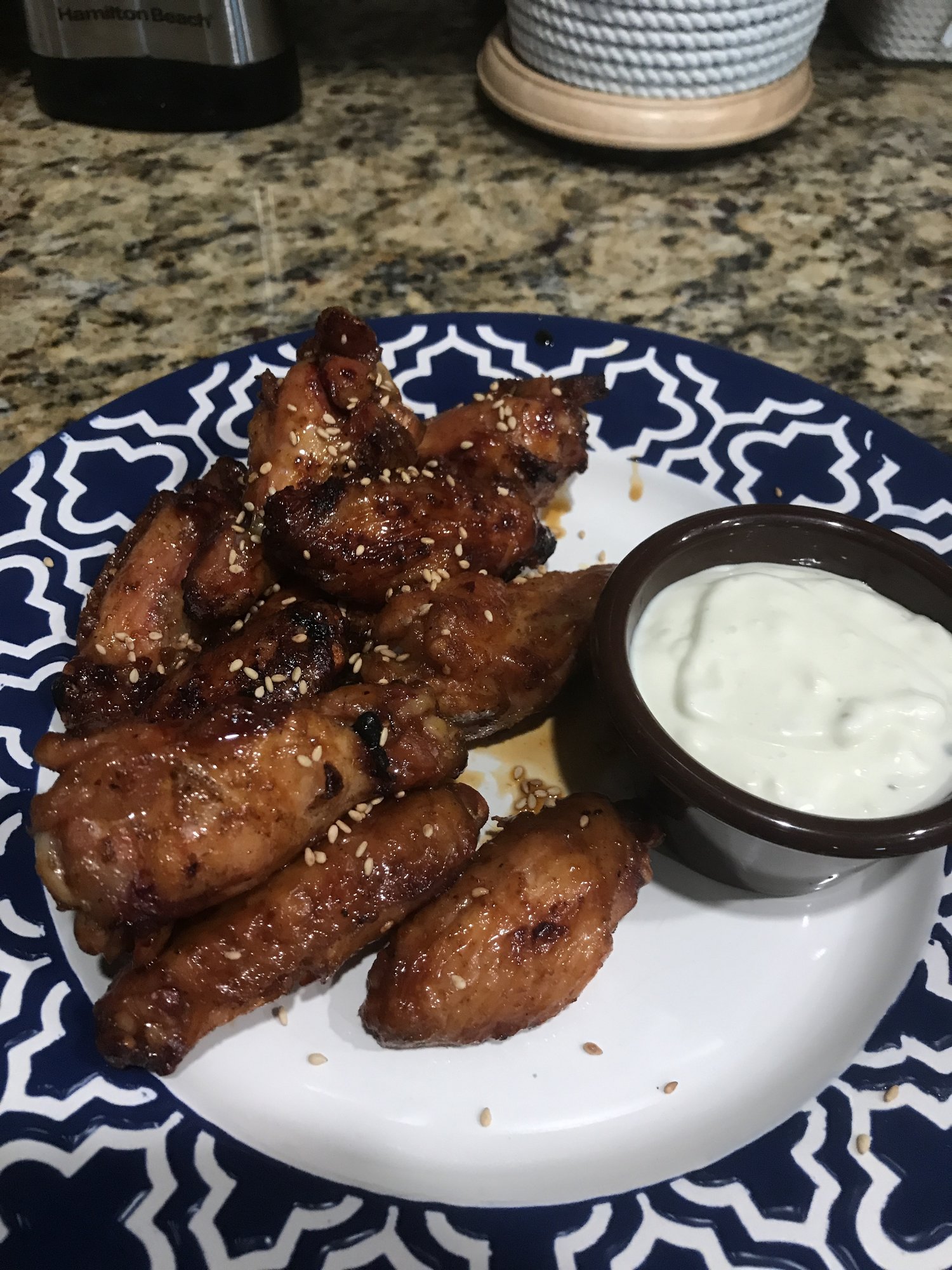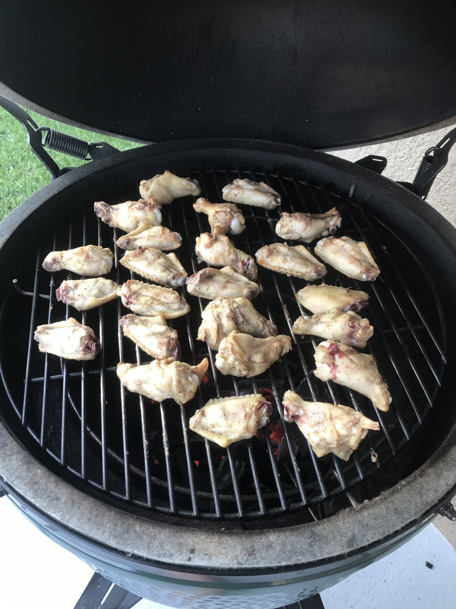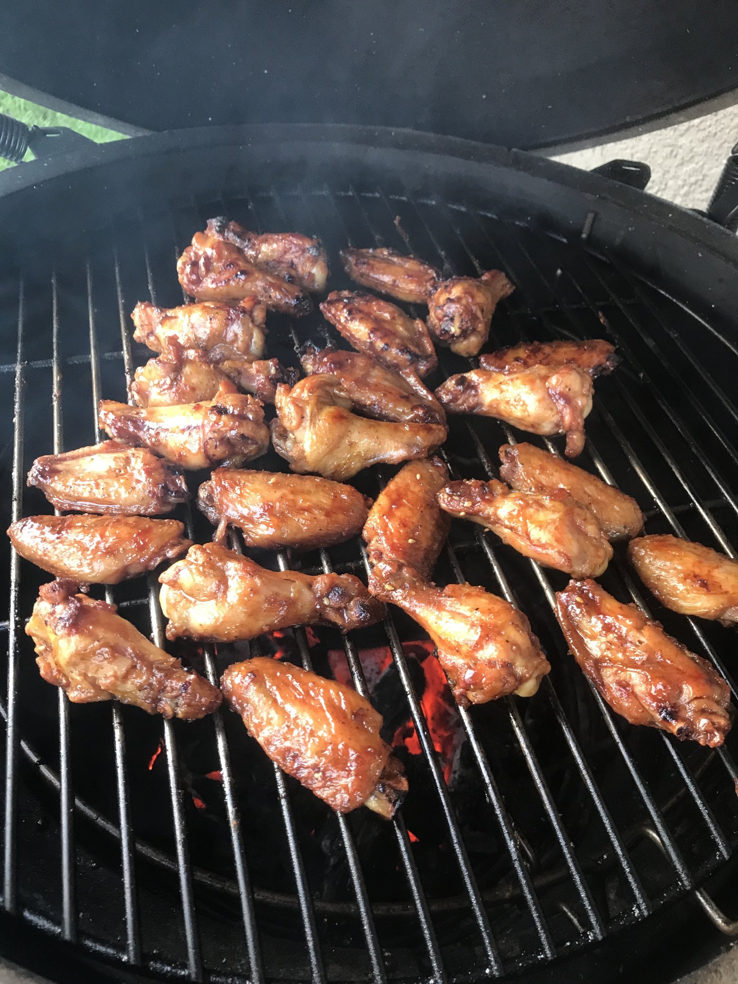 Hadn't had wings in awhile, so decided it was time to fire up the egg and get some going. I've done wings indirect that have turned out great, but figured I'd try a raised/direct method to see which ones I prefer. Got the egg stabilized at 350, put 2 1/2 lbs of wings on, seasoned with Everglades all purpose rub. Turned over every several mins til done (about 40 mins total). Went with a hot terryaki sauce (crystal and soy vay) and put em back on the grill for a few minutes to carmelize.