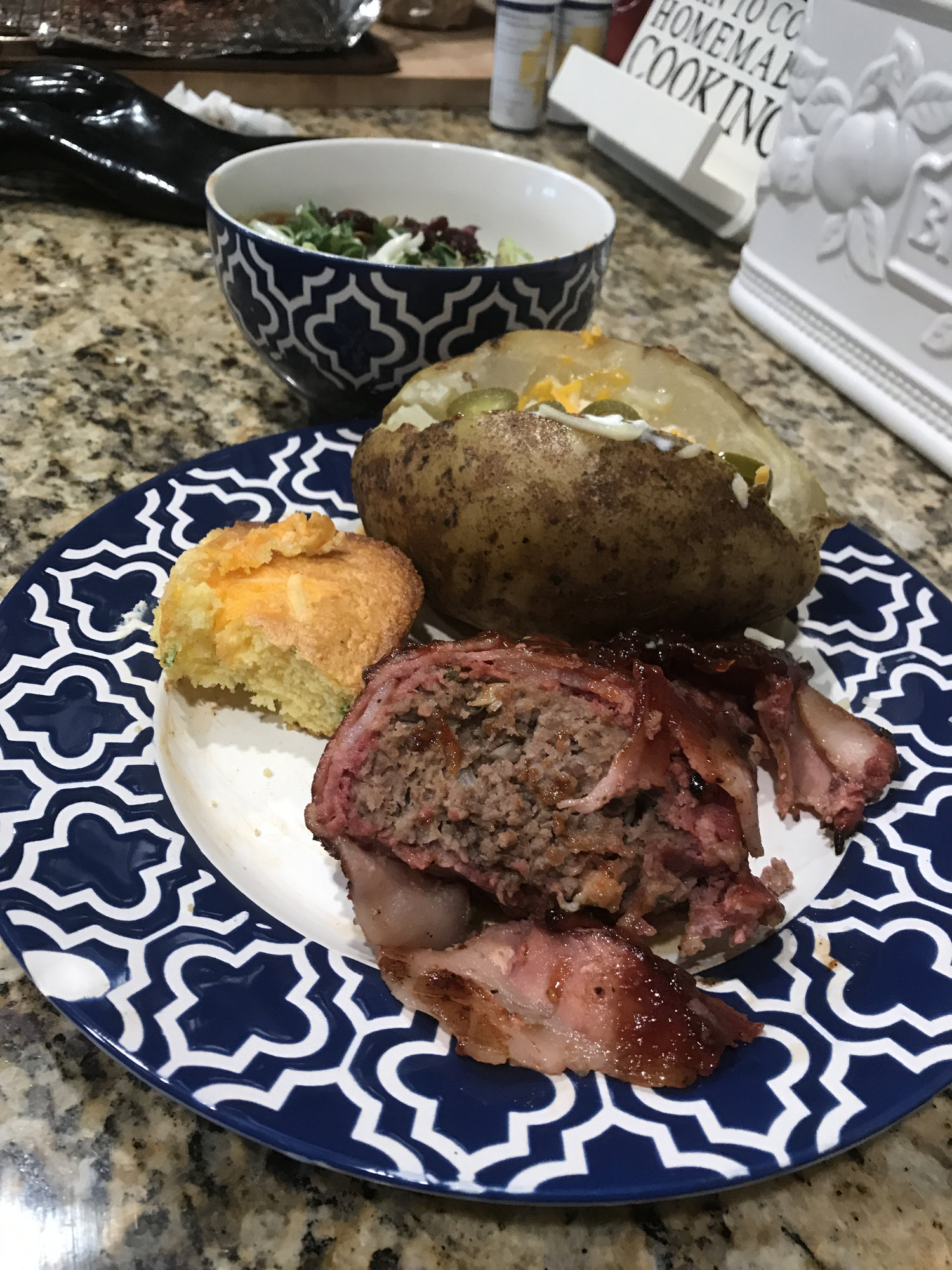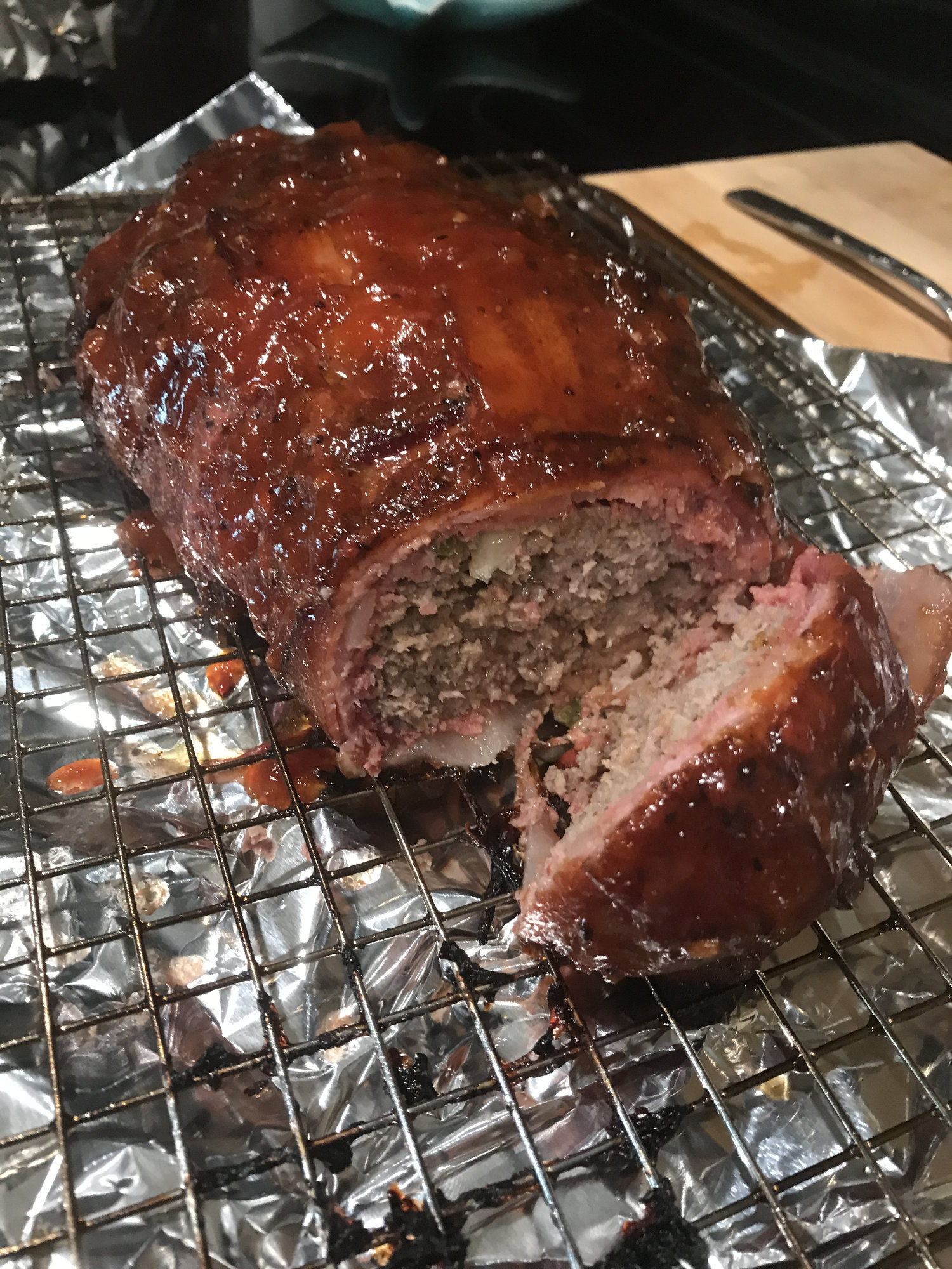 Decided to try something new on the egg today. Had 1.5 lbs of 80/20 ground chuck, 1/2 a lb of ground sausage, egg, sleeve of ritz, dashes of Worcestershire and hot sauce, diced sweet onion and a Jalepeno. Did my first bacon weave and seasoned with a bourbon brown sugar rub from Weber grill mates.