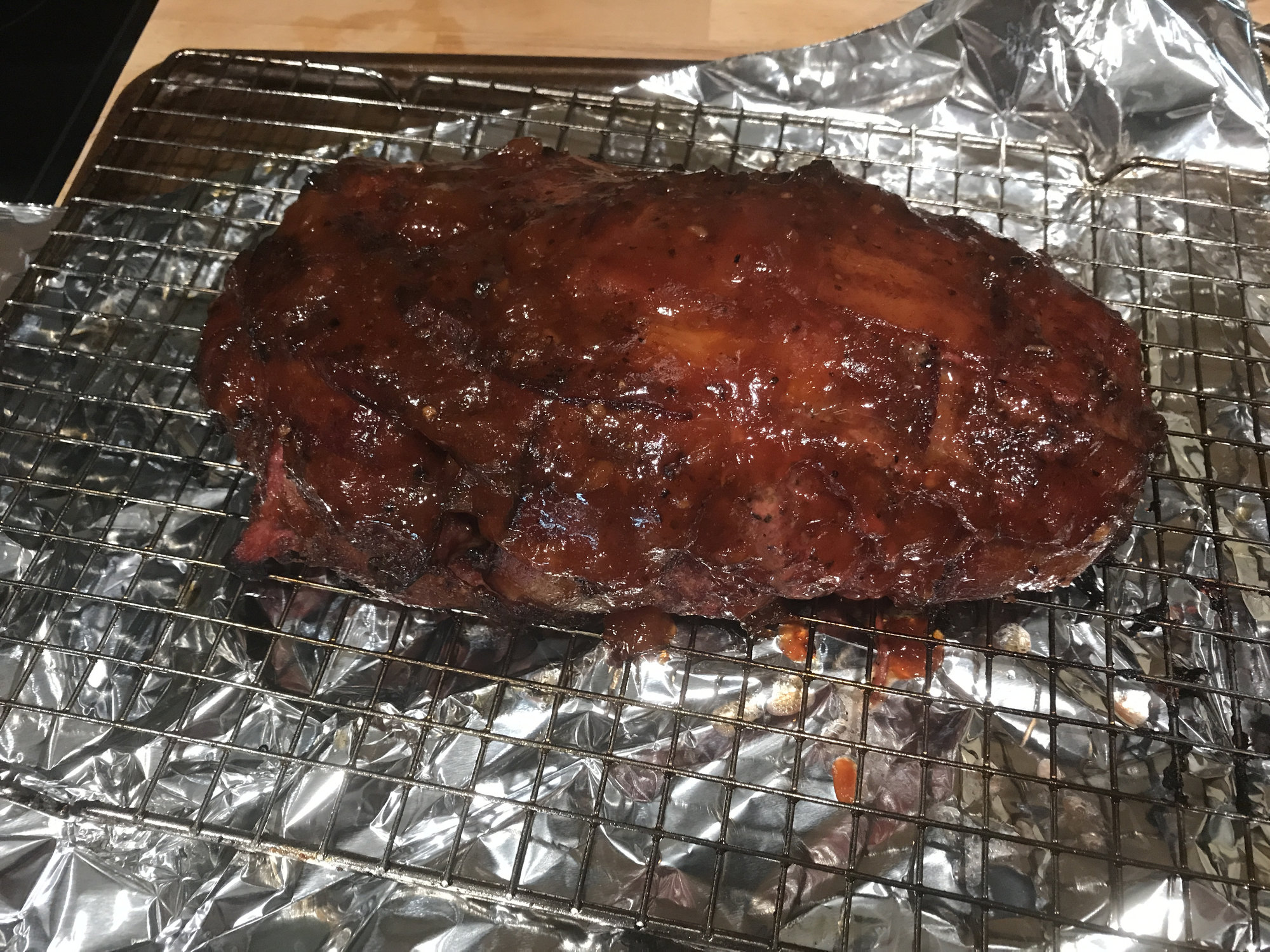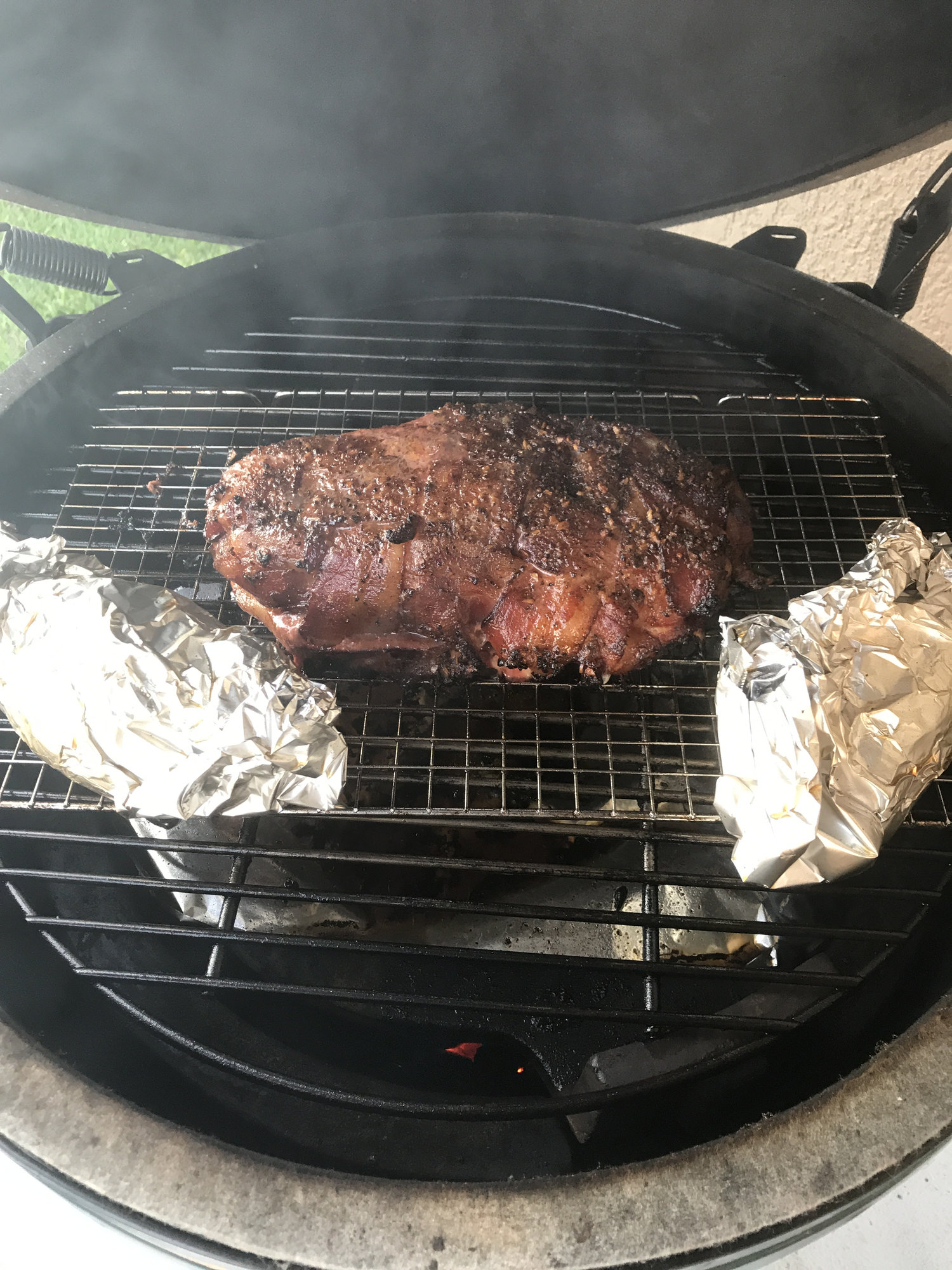 Got the egg to around 325 for about an hour and a half, then glazed with apricot/pineapple jelly, Heinz chili sauce and brown sugar mix. Served with baked potatoes, jalepeno cornbread and salad.