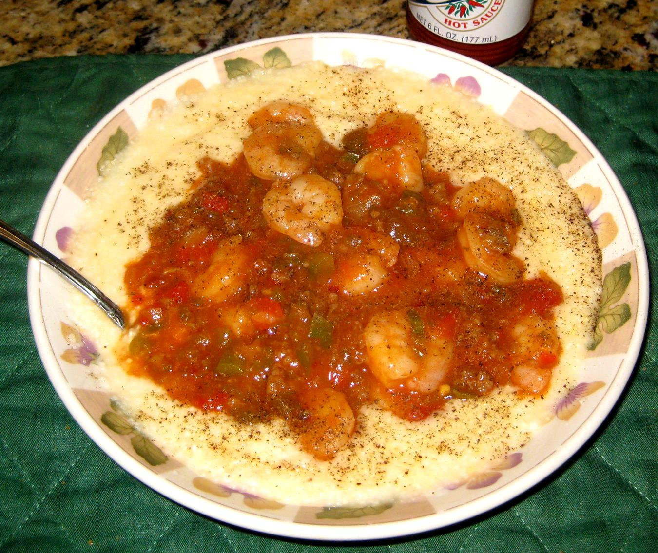 Mostly use freshly ground grits from a local grist mill, usually white grits or speckled grits, but sometimes use instant grits if we are out of ground grits. Always add some grated cheese to stir into the grits, then top the grits with the shrimp and sauce concoction, where I then add hot sauce to mine as my wife does not like it with hot sauce and it is easier for me to add it afterward.