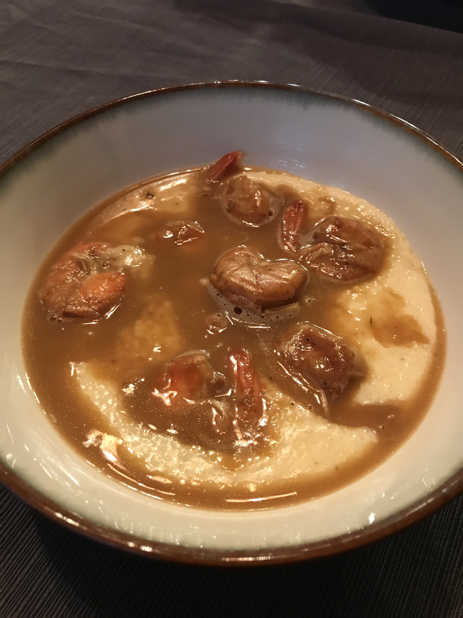 Shrimp and grits is one of our favorite meals. Not much fresh shrimp here, so it is usually the frozen ones.