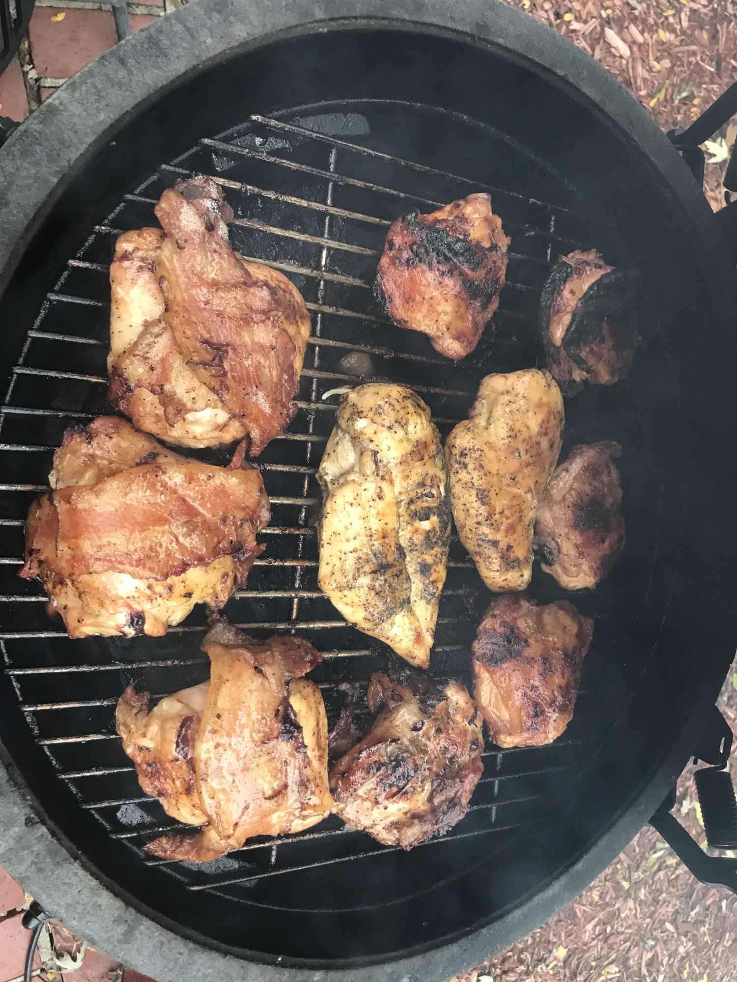 Once she’s cranked up I have to keep cooking. Tried over the top chili (good grief where has it been my whole life), wings, and thighs ( a few wrapped in jowl bacon. I may have an addiction. Great day for cooking!