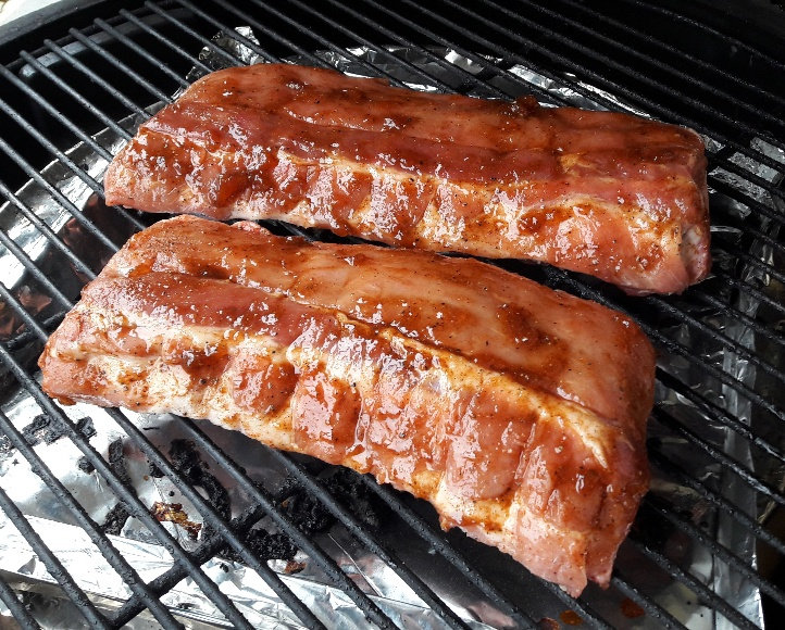 4.5 hrs into it, poured craft honey spicy bbq sauce on em and foiled them up.   Left em on for 30 more mins