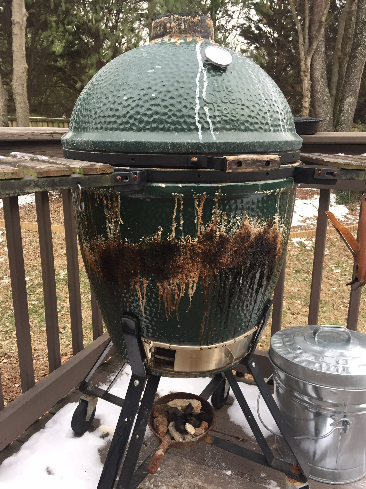 My hypothesis on this situation is that (a) you don't use drip pans (I don't), or (b) you don't do a claening burn often enough (I don't), or (c) you do too many low and slow cooks (like me). The fix is to do more pizza cooks and cleaning burns all 12 months of the year and let rain and snowfall clean the outside of your BGE. (That's what I do now)