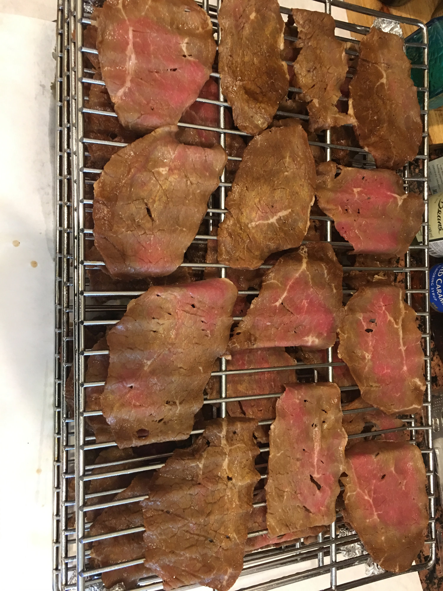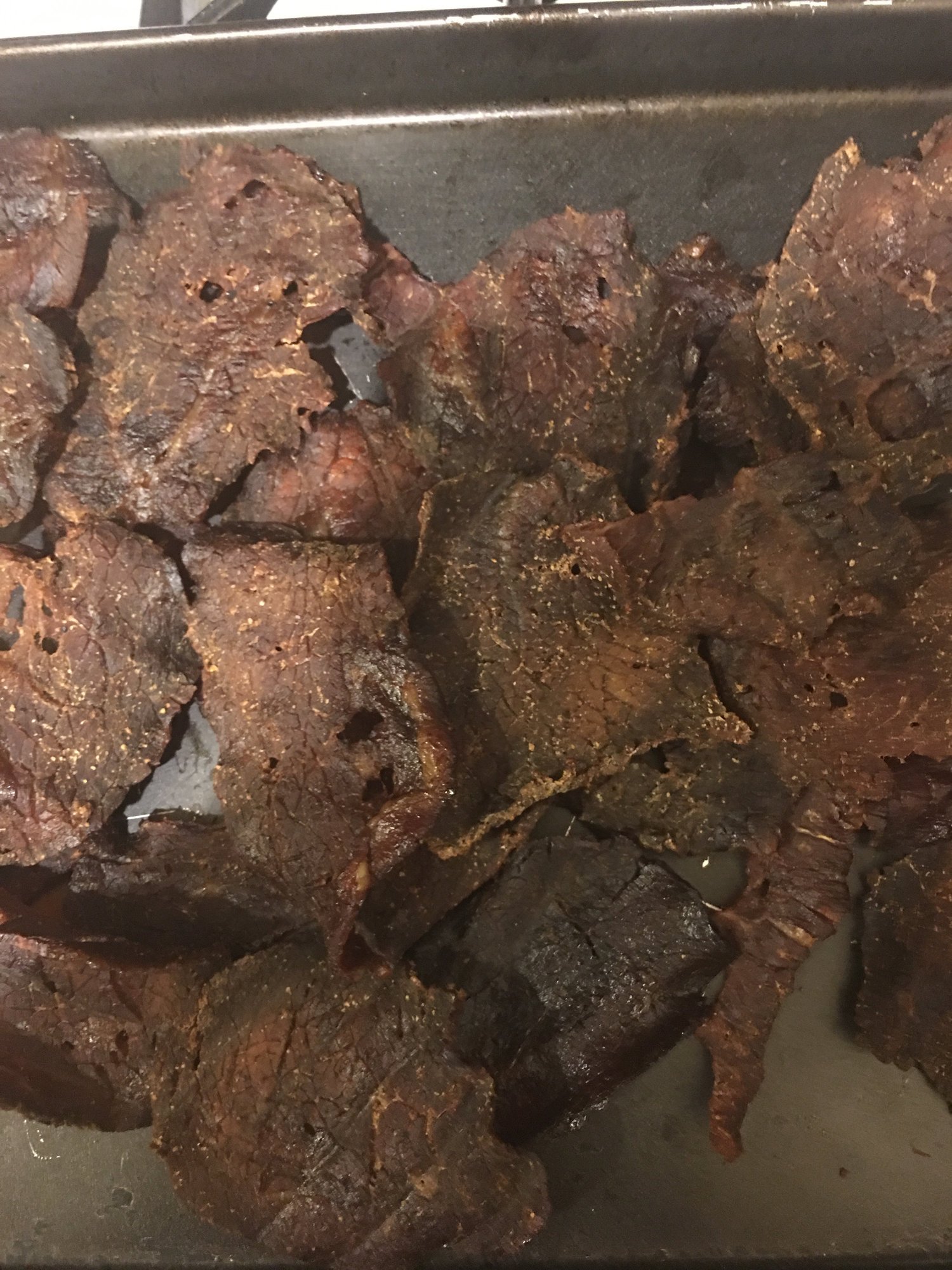 Here is a picture of the same batch. Bottom was dehydrator, top was on the smoker.