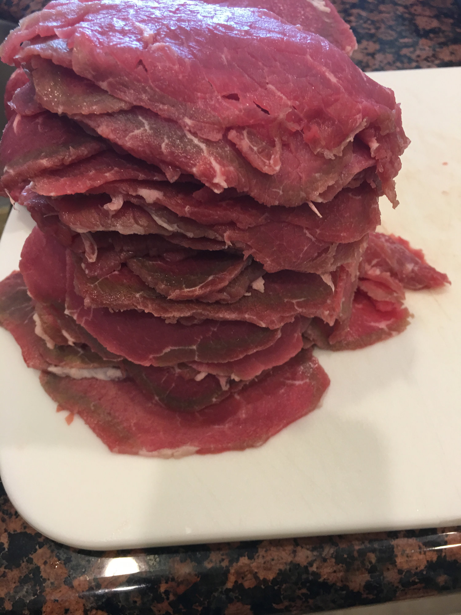 • @Moleman I used eye of round that I cut into 3/4 inch 'steaks' along the grain. Partially froze them and cut them into 1/4-3/8 inch strips.
