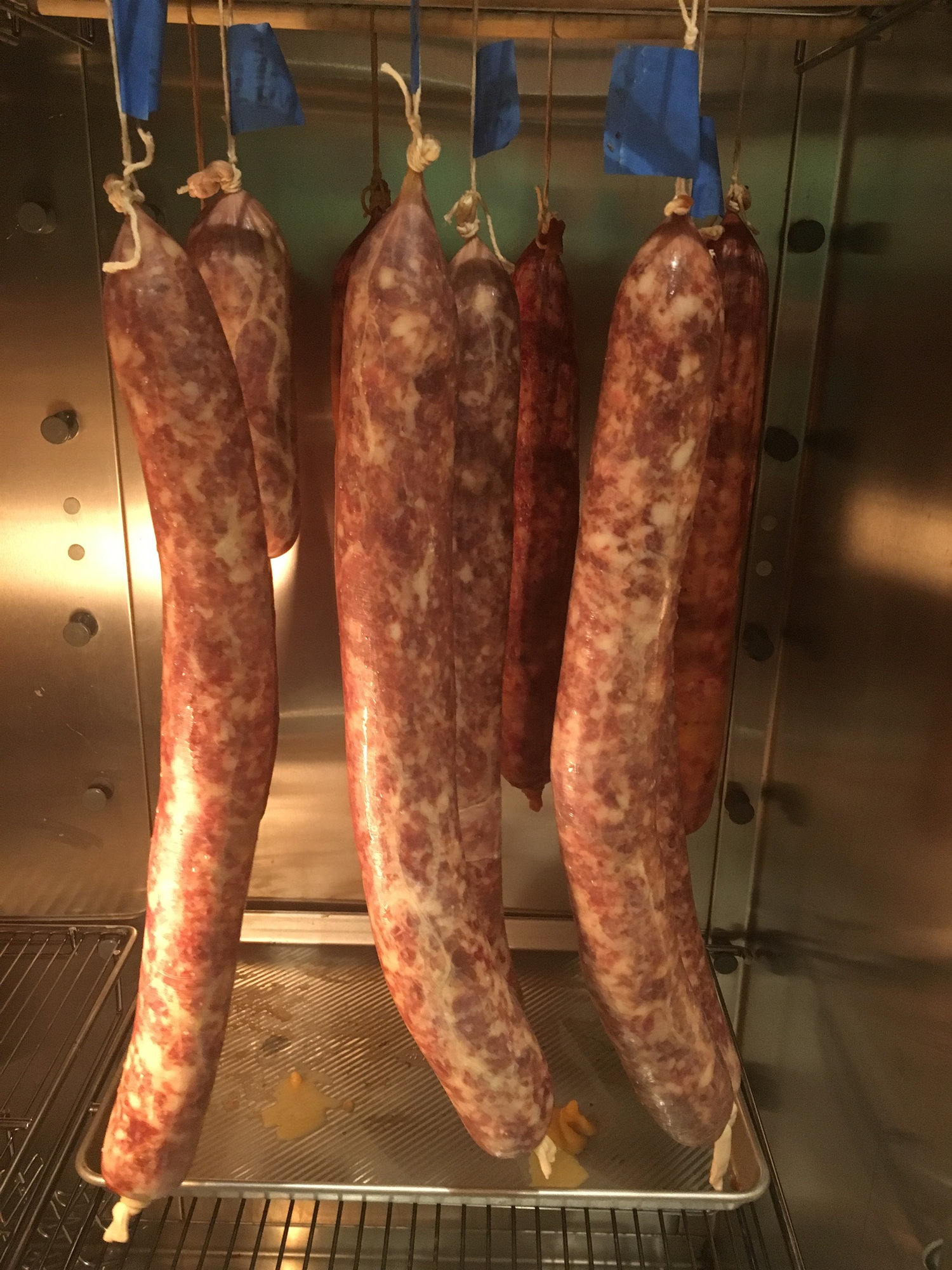 (Foreground - Brisket missiles drying before hot smoking, Background - Prosciutto 1 year in, 1 year to go)