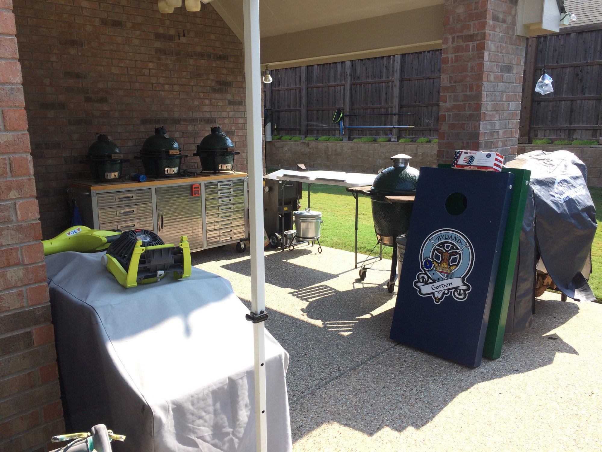 Large BGE, MiniMAX BGE, 2 Mini BGE's, R&V Fryer, 36" Blackstone Griddle, Camp Chef Dual Burner 40K BTU StoveBGE ChimineaProsper, TX