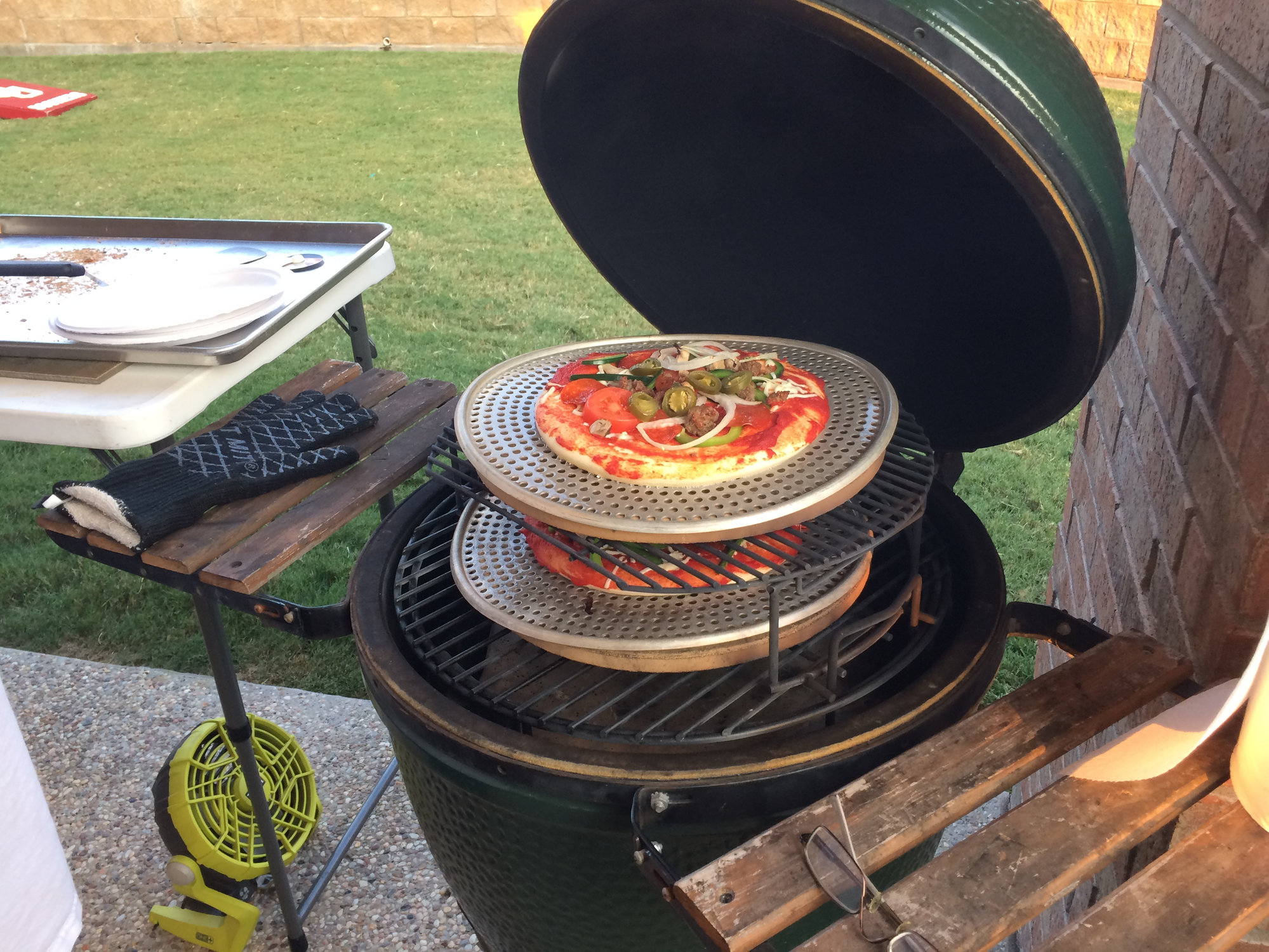 It's not easy to cook two pizzas simultaneously on the Large BGE (due to stacking grates and different temps at each level) but when you're entertaining for 8 or more, it sure is frustrating to cook only one at a time. I'll call Tom @ CGS and see what he has to say. Thanks all for your thoughts.