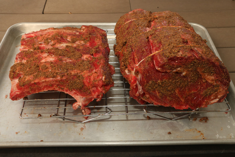 I chose to tie up the roast to get a rounder shape.  Everything was rubbed with Mr's O'Leary's Cow Crust (recipe from AmazingRibs as well).