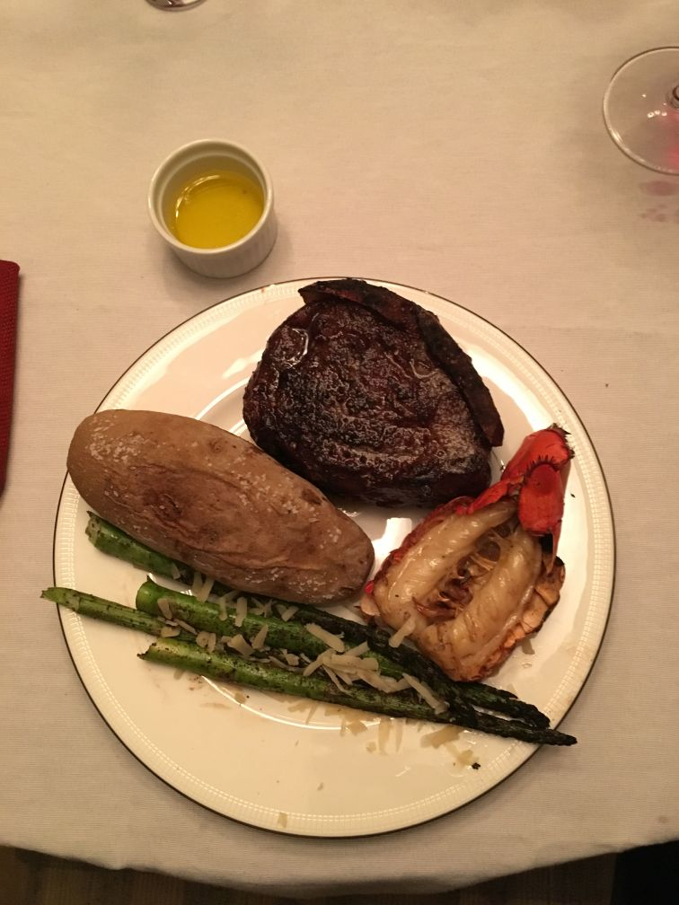 SRF bone-in filet for me, boneless for SWMBO. Reverse sear at 225* to IT of 120* on LBGE, with cherry wood for me, sous-vide and sear for her (no smoke for her filet). Grilled lobster tail with herb butter, baked potato, and asparagus. Etude Pinot Noir. Merry Christmas!