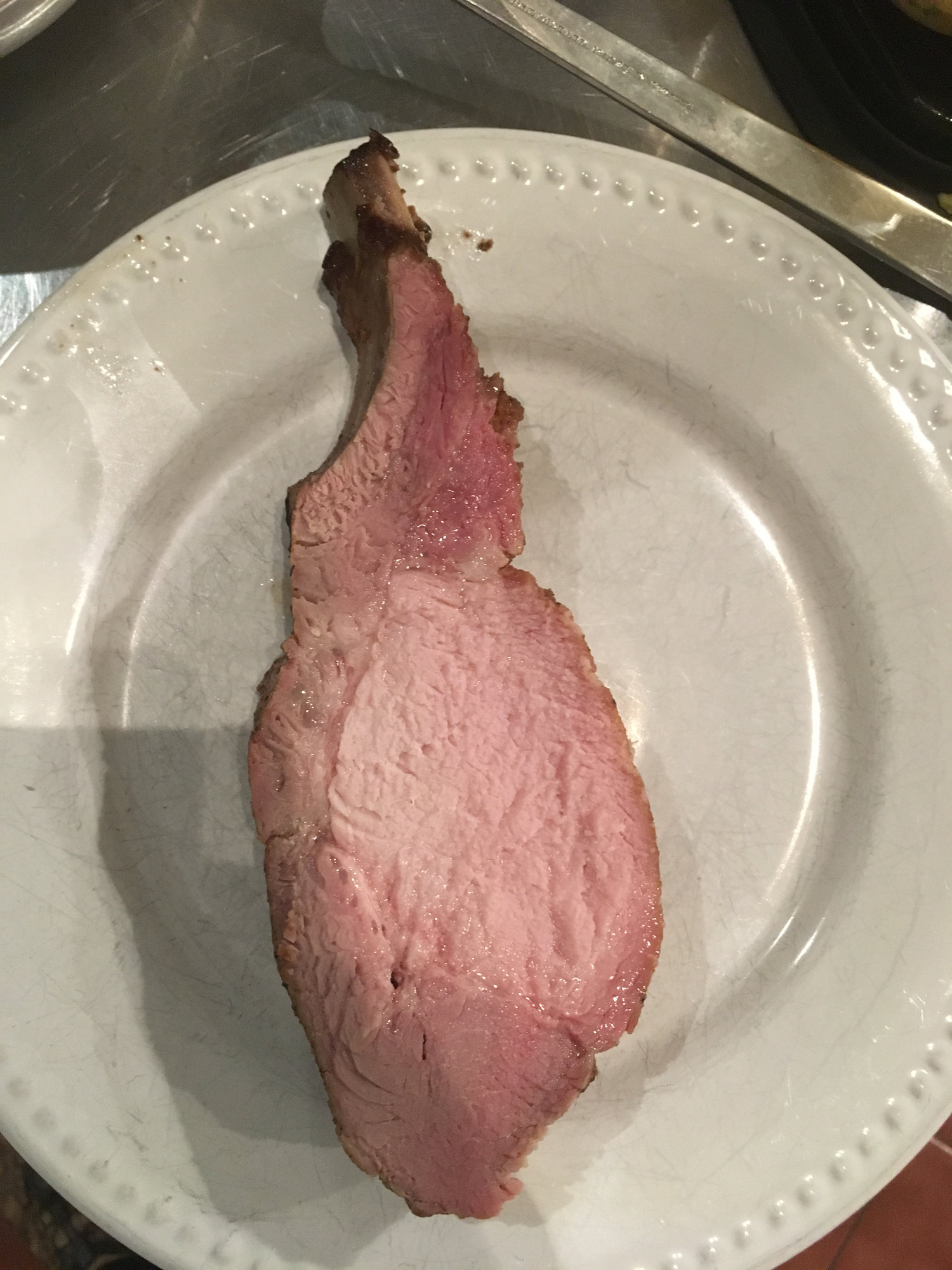 For any unfamiliar the pic below is a cut from our holiday rack of pork roast. The cut includes a baby back rib with all the rib meat along with some darker meat around the one side and the whiter pork loin inside. This roast was so popular with the fam I felt compelled to re-post for any new Eggsters who might not know, especially since I only see it during the holidays at Costco. It cooks up in less that two hours and the only way it isn’t a hit is if you way overcook it. We did ours until center hit 147F, then let rest and served. Pork prime rib. Happy New Year!!!