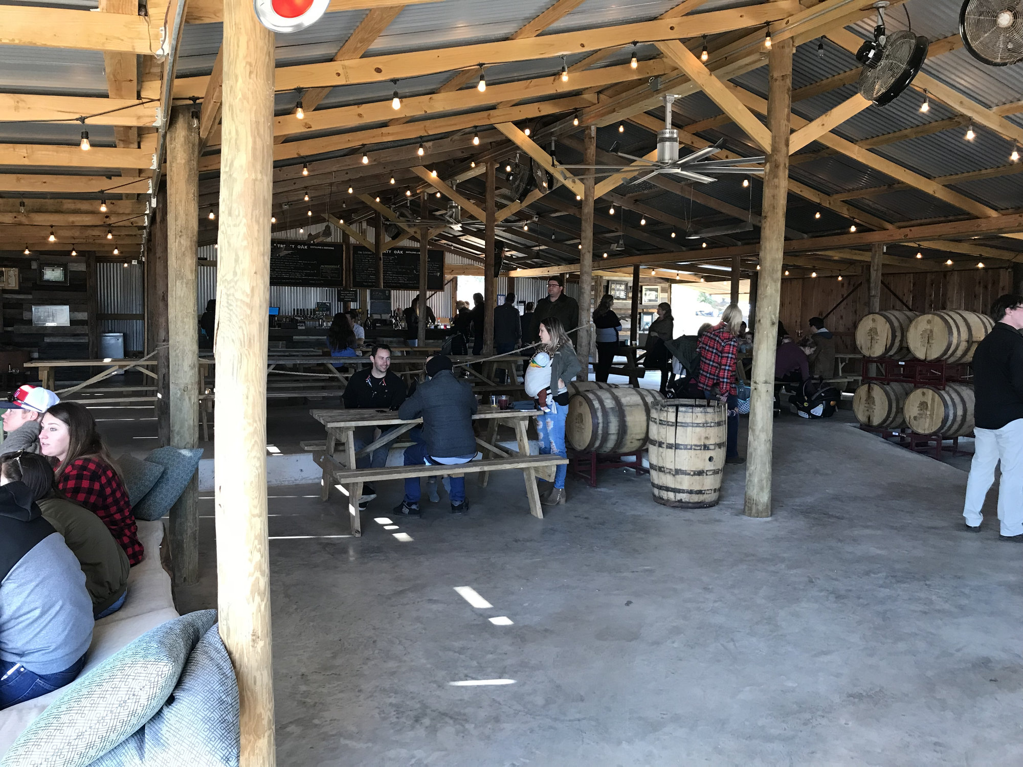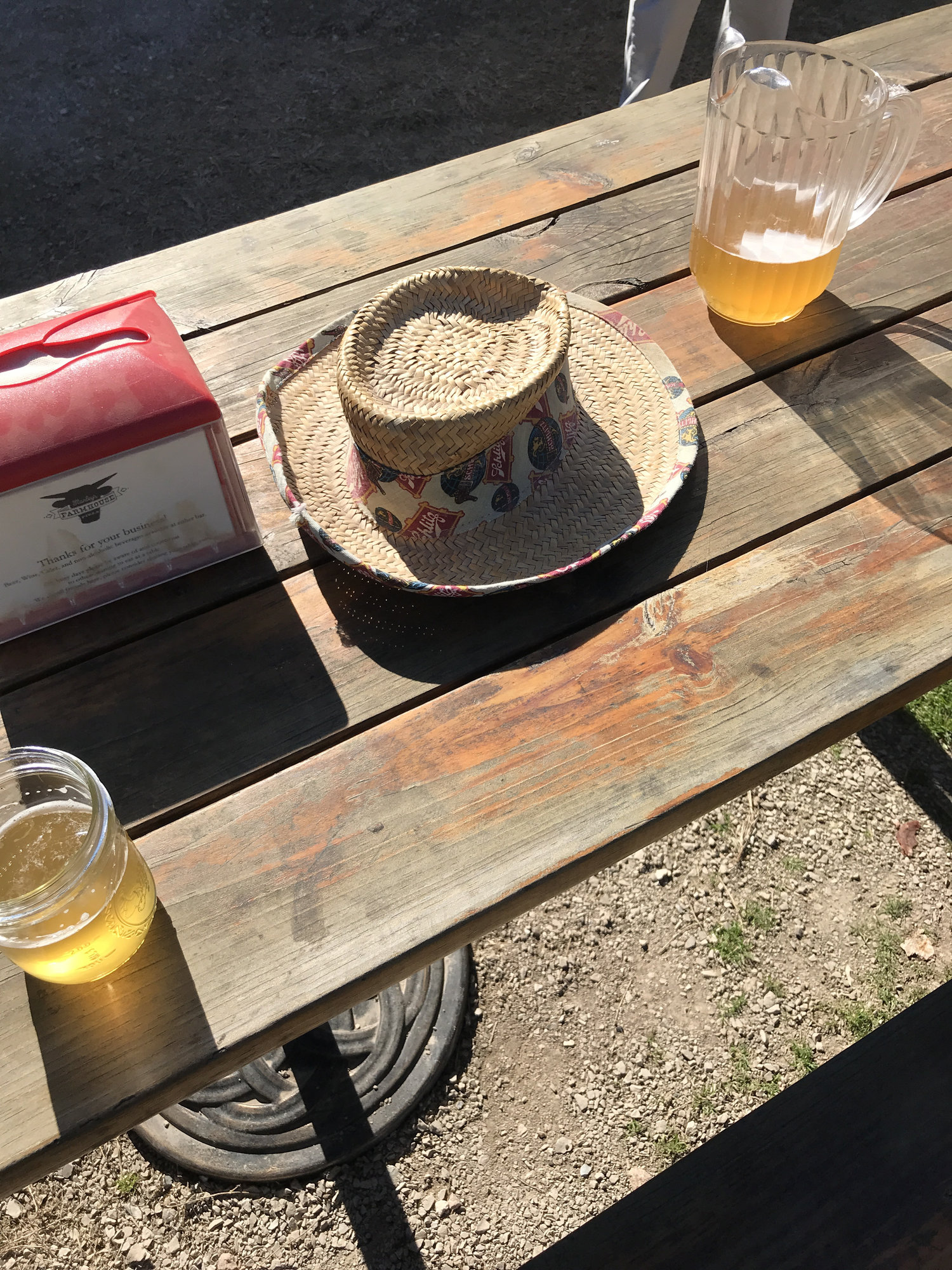 We are here! Outside at a picnic table tight by where you order pies. Schlitz hat prominently displayed on the table.