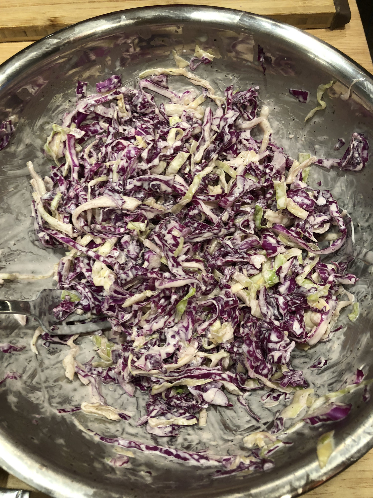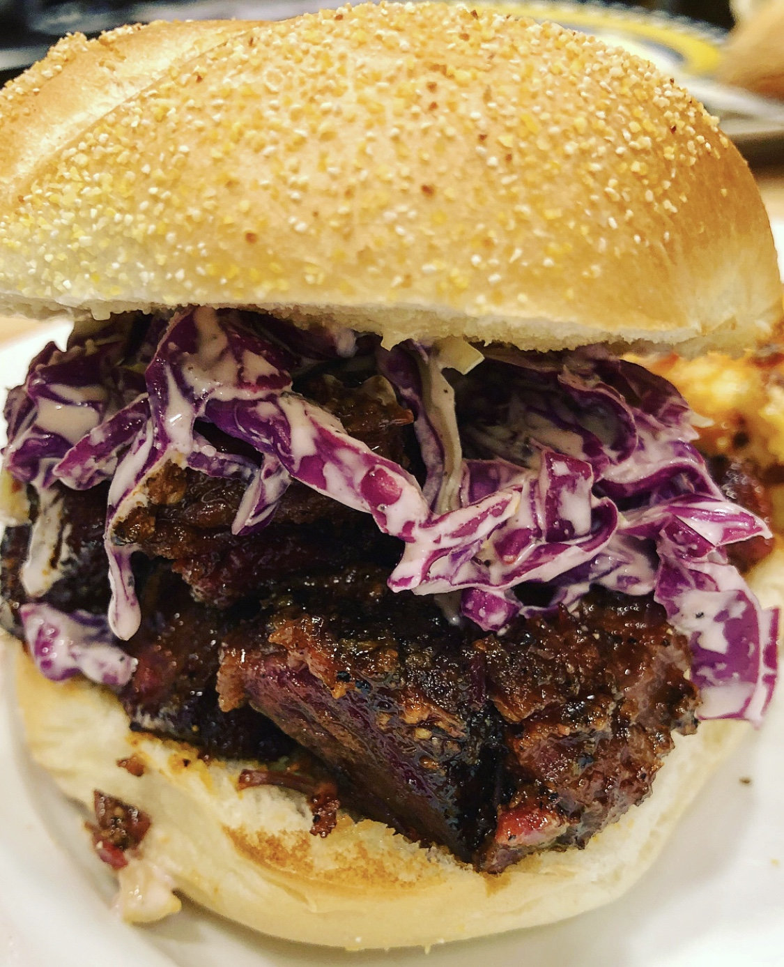 Final product.... loved the result! Strong beef flavor with good spice and super tender. Baked mac and cheese recipe was a keeper. Vinegar in slaw balanced out the fat in the beef. Toasted Sheboygan hard roll to boot!