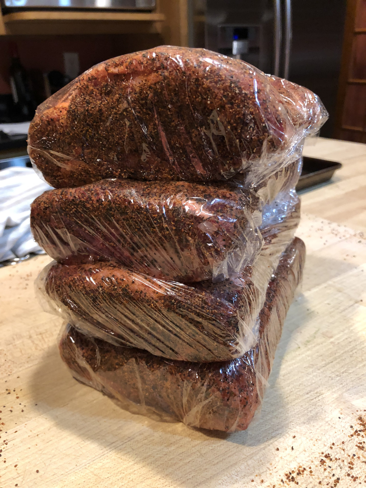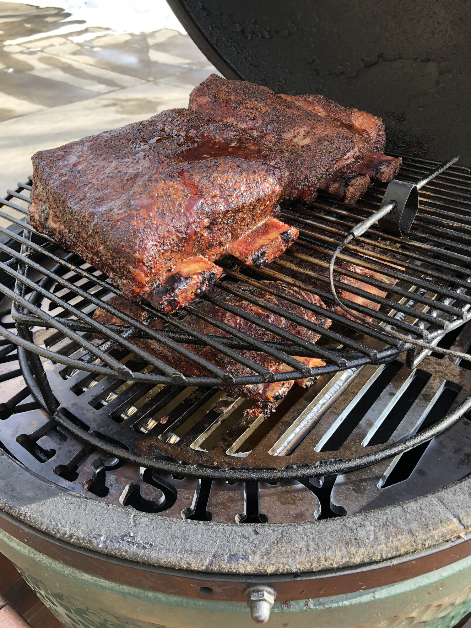 Rubbed last night with Holy Cow rub and wrapped in the fridge overnight. Put them on the egg this morning at 250 indirect with oak. Smoked until I ran out of coals