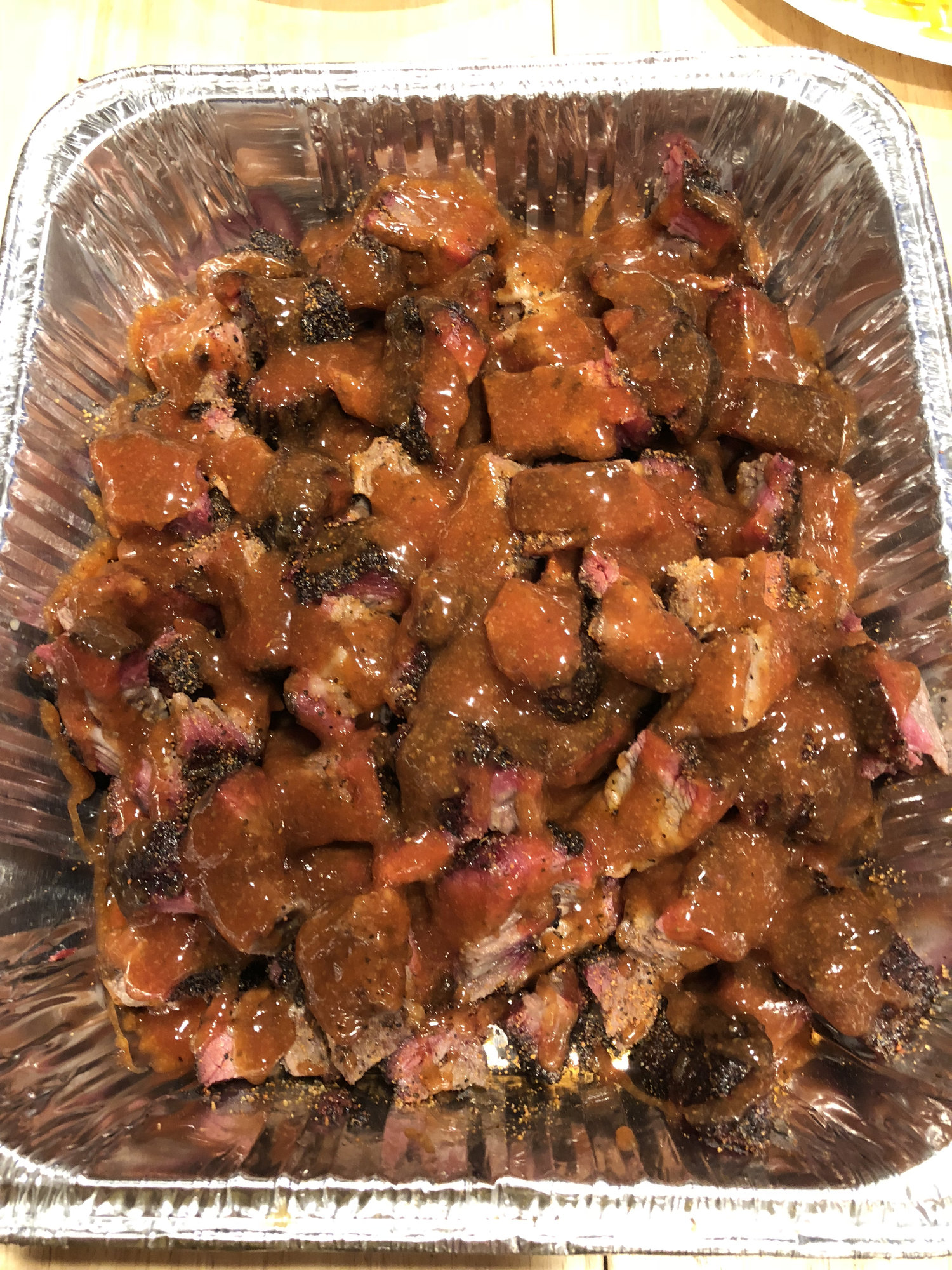 Pulled them off, cubed and added some more rub, a little sauce and some water.