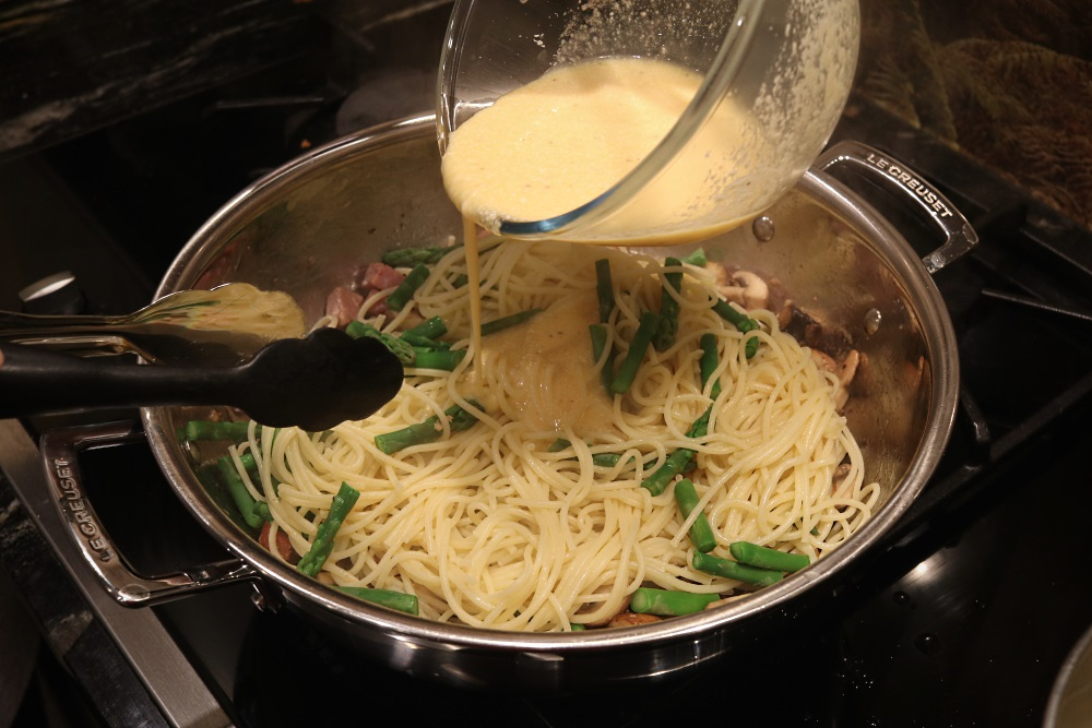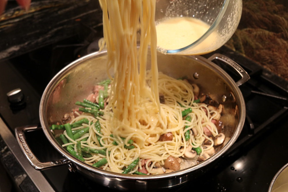 Mixing in the carbonara sauce with the pasta: