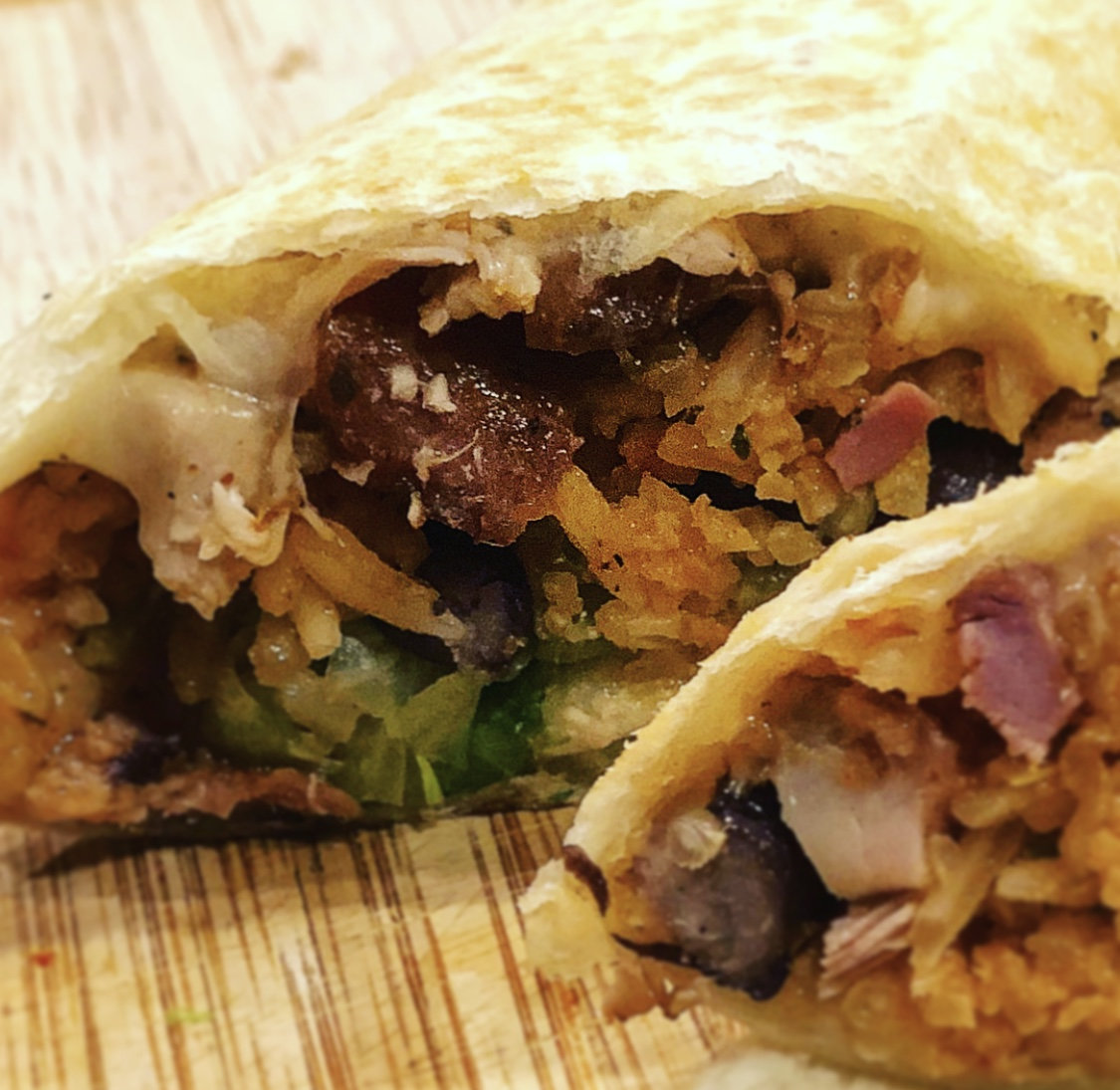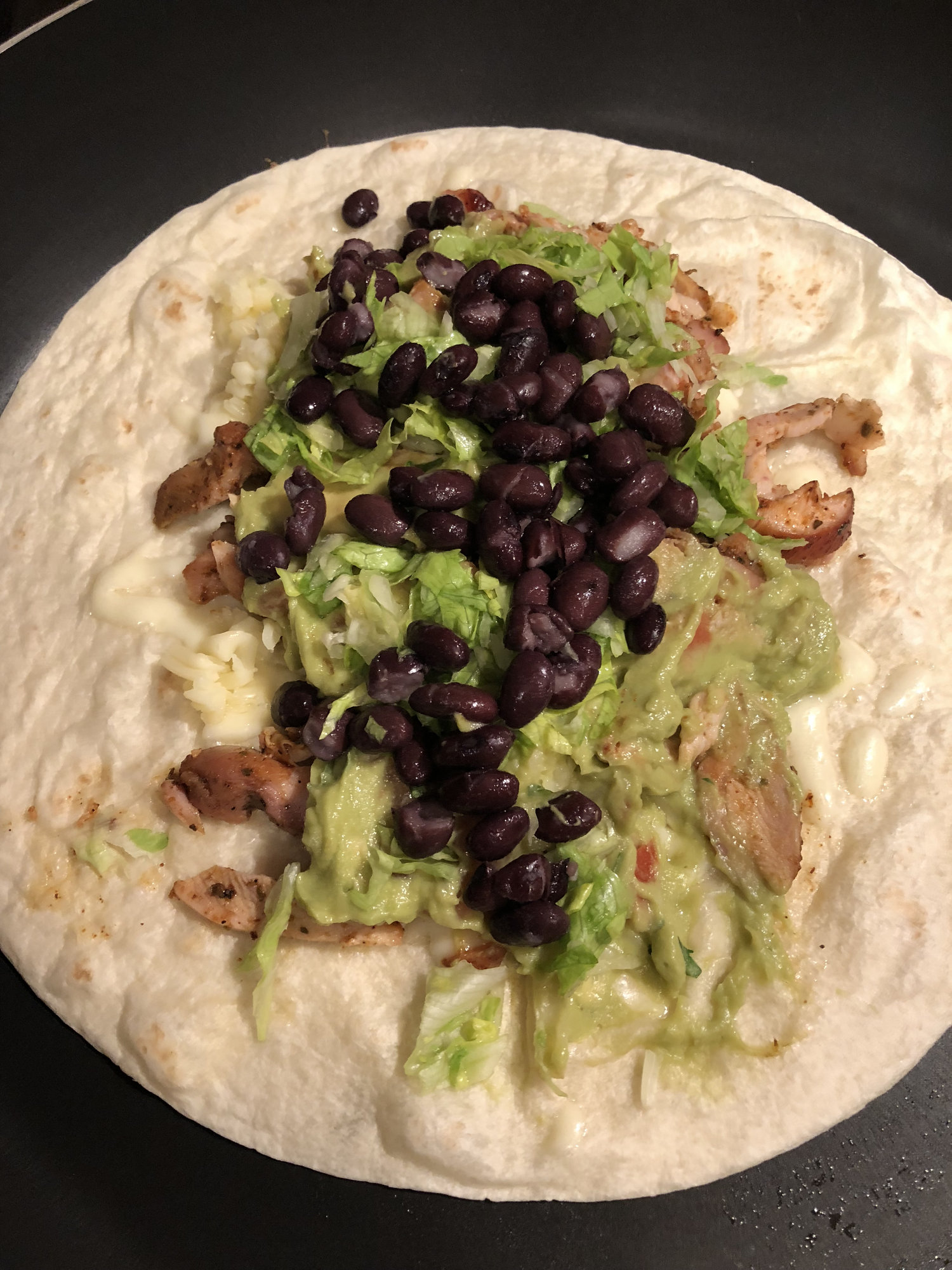 Burritos!!! Pecan smoked chicken thighs, Mexican rice, blacks beans, guac, jack cheese, lettuce, sour cream....
