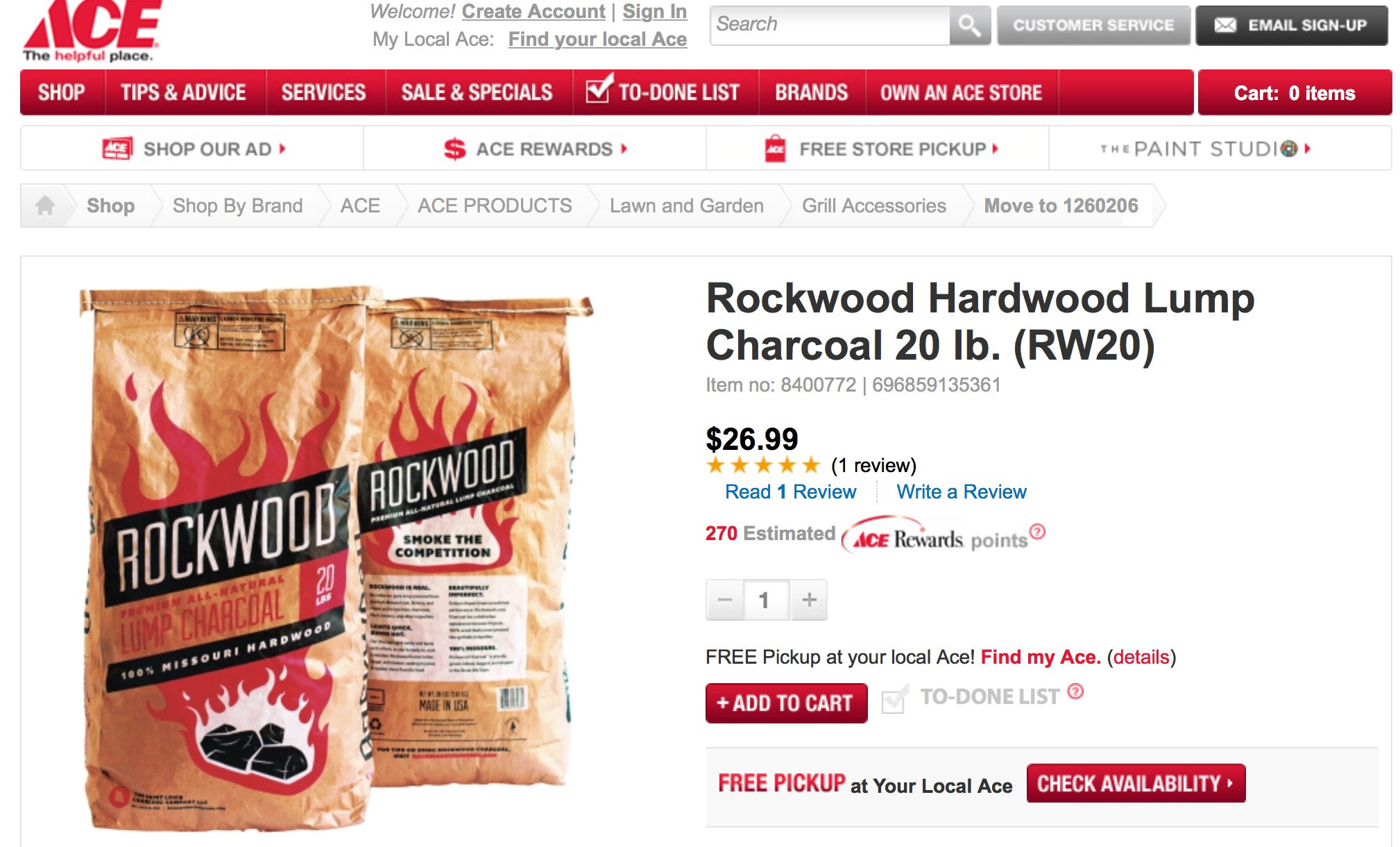 I just checked, not available from Ace any longer. But they also don't list Rockwood on their site either, Just Kamado Joe and Cowboy for lump.